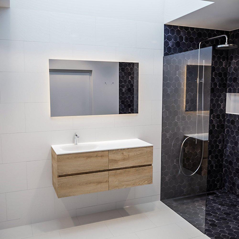 MONDIAZ VICA Badkamermeubelset - 120cm - 4 lades - wasbak Moon links - 1 kraangat - solid surface washed oak