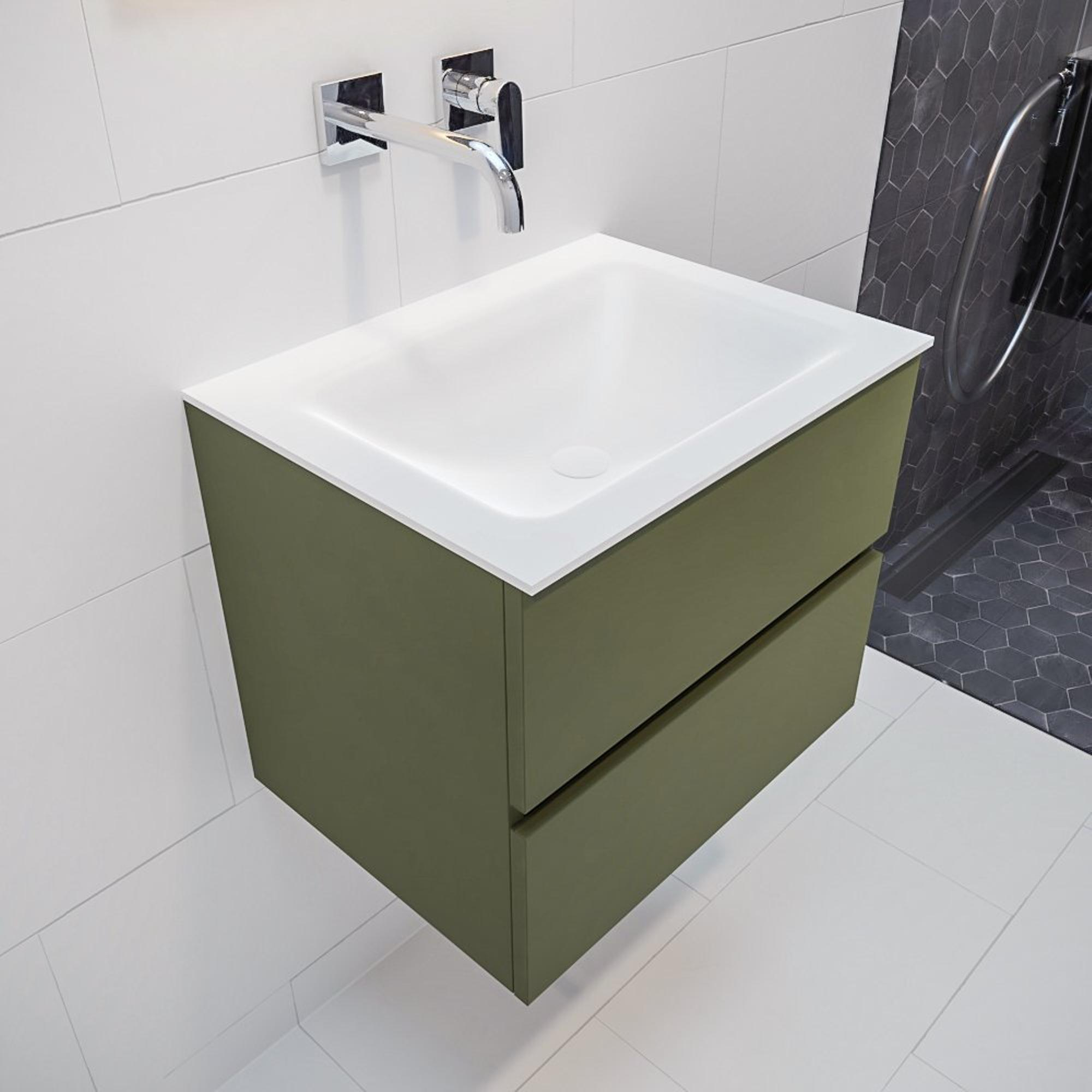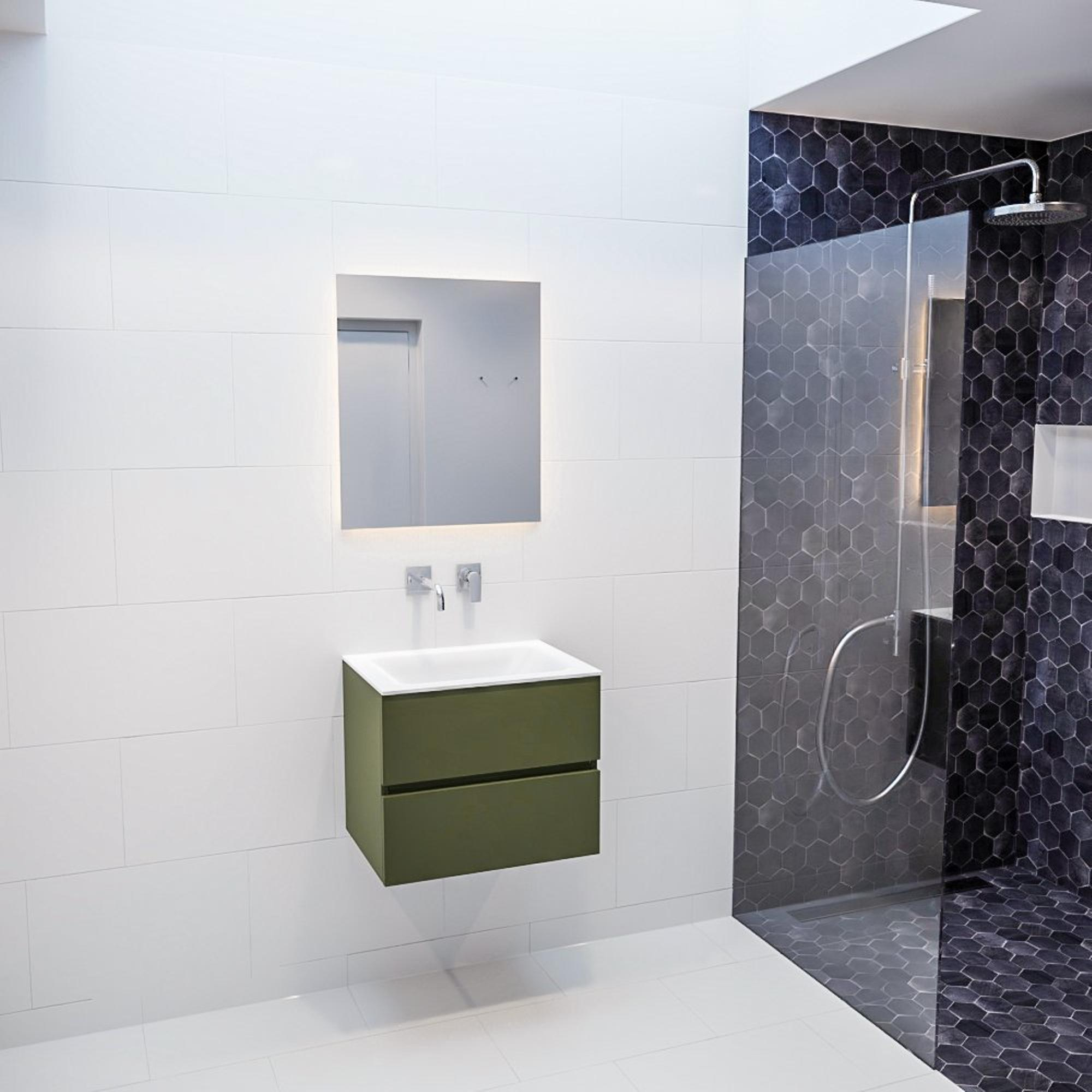 Het gebruik van hoogwaardige materialen zoals solide surface zorgt ervoor dat dit badkamermeubelset duurzaam en bestand is tegen dagelijks gebruik. Het army kleurige solide surface is niet alleen sterk en krasbestendig, maar behoudt ook zijn kleur en glans langdurig. Hierdoor geniet je jarenlang van dit prachtige meubel in je badkamer.