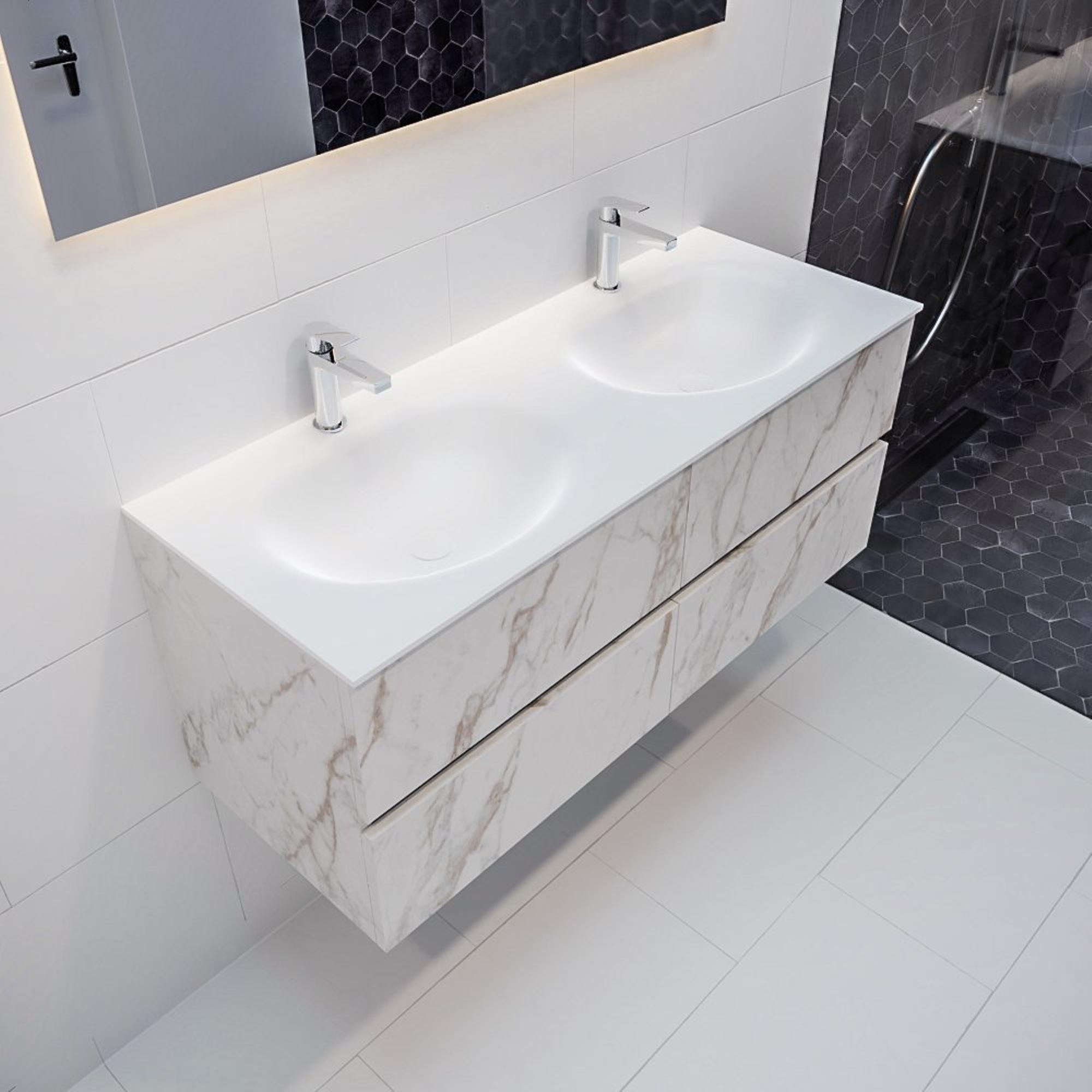 MONDIAZ VICA Badkamermeubelset - 120cm - 4 lades - wasbak Moon dubbel - 2 kraangaten - solid surface carrara marmer