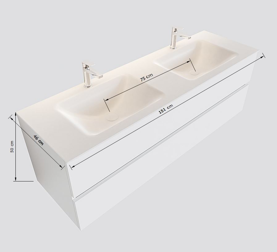 MONDIAZ VICA Badkamermeubelset - 150cm - 2 lades - wasbak Moon dubbel - 2 kraangaten - solid surface carrara marmer