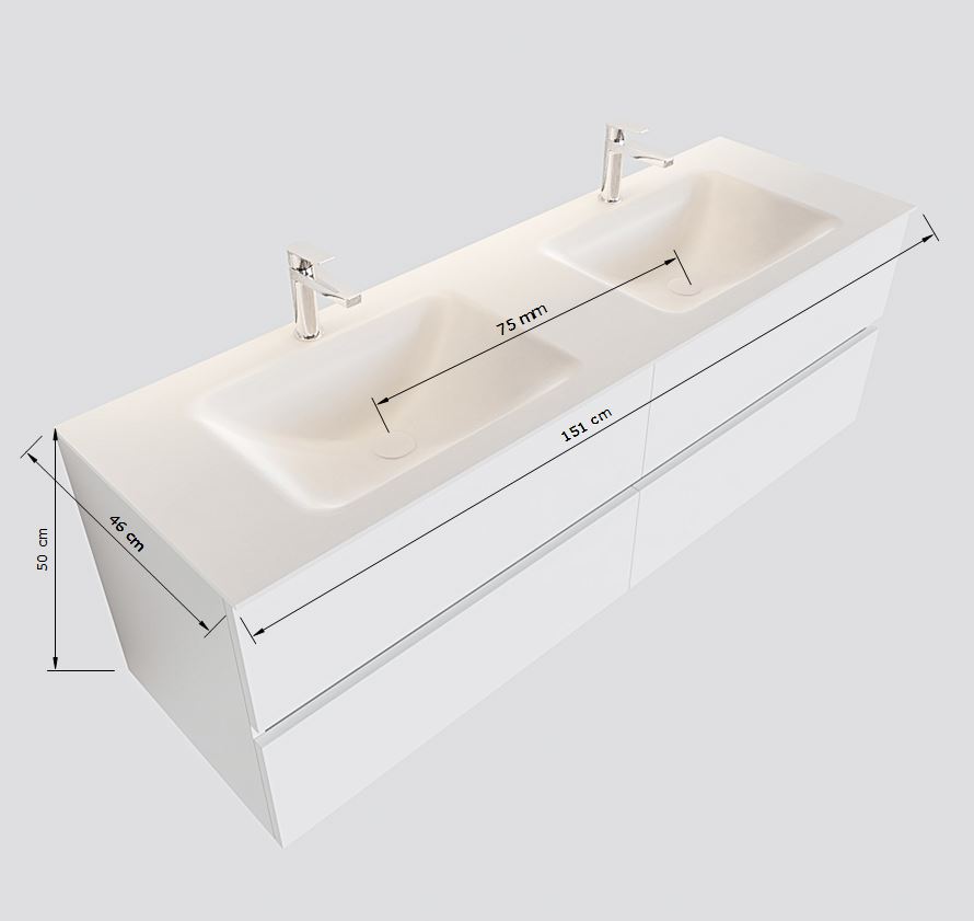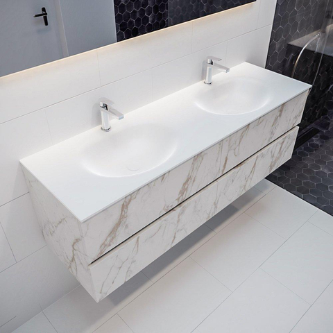MONDIAZ VICA Badkamermeubelset - 150cm - 4 lades - wasbak Moon dubbel - 2 kraangaten - solid surface carrara marmer