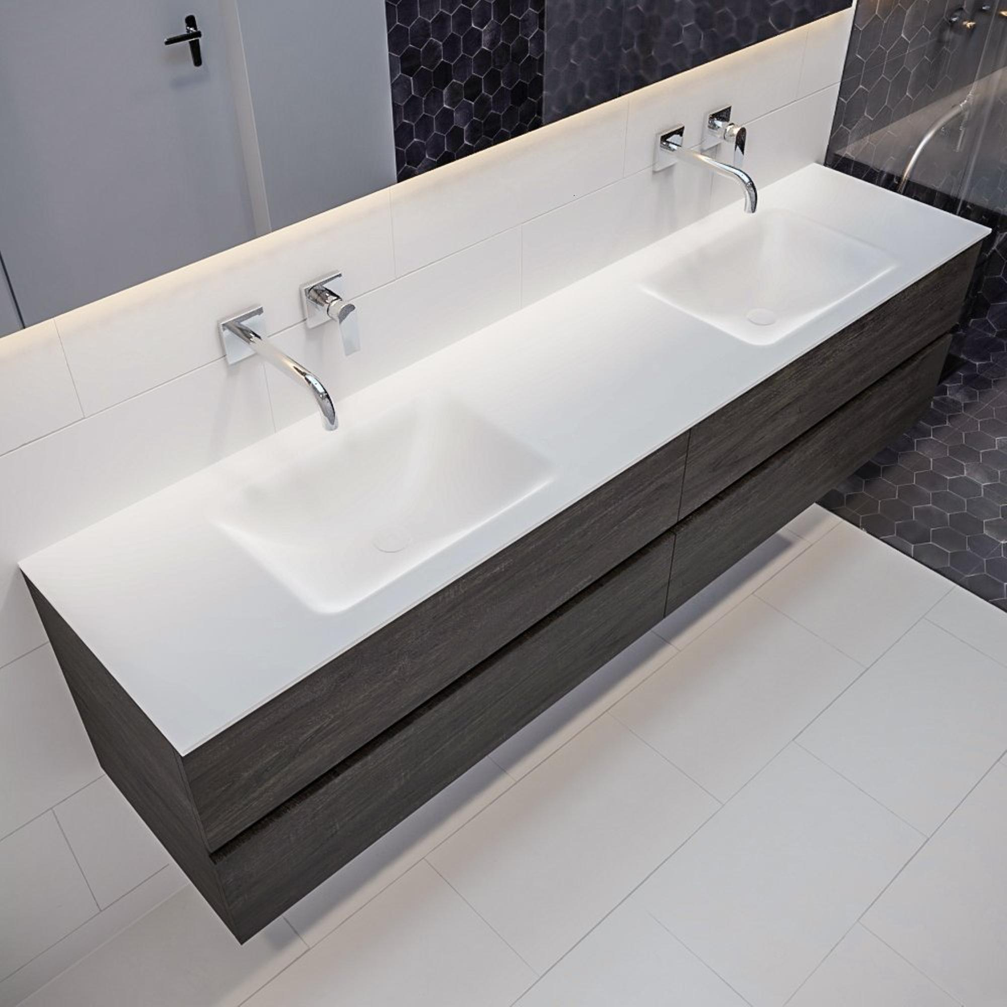 Naast zijn esthetische waarde is dit badkamermeubelset ook zeer functioneel. Met 4 ruime lades biedt het voldoende opbergruimte voor al je badkamerspullen, van handdoeken tot toiletartikelen. De dubbele wasbak maakt het mogelijk voor twee personen om tegelijkertijd gebruik te maken van de wastafel, wat handig is tijdens drukke ochtenden. Bovendien is het solid surface materiaal duurzaam, gemakkelijk schoon te maken en bestand tegen vocht en vlekken.