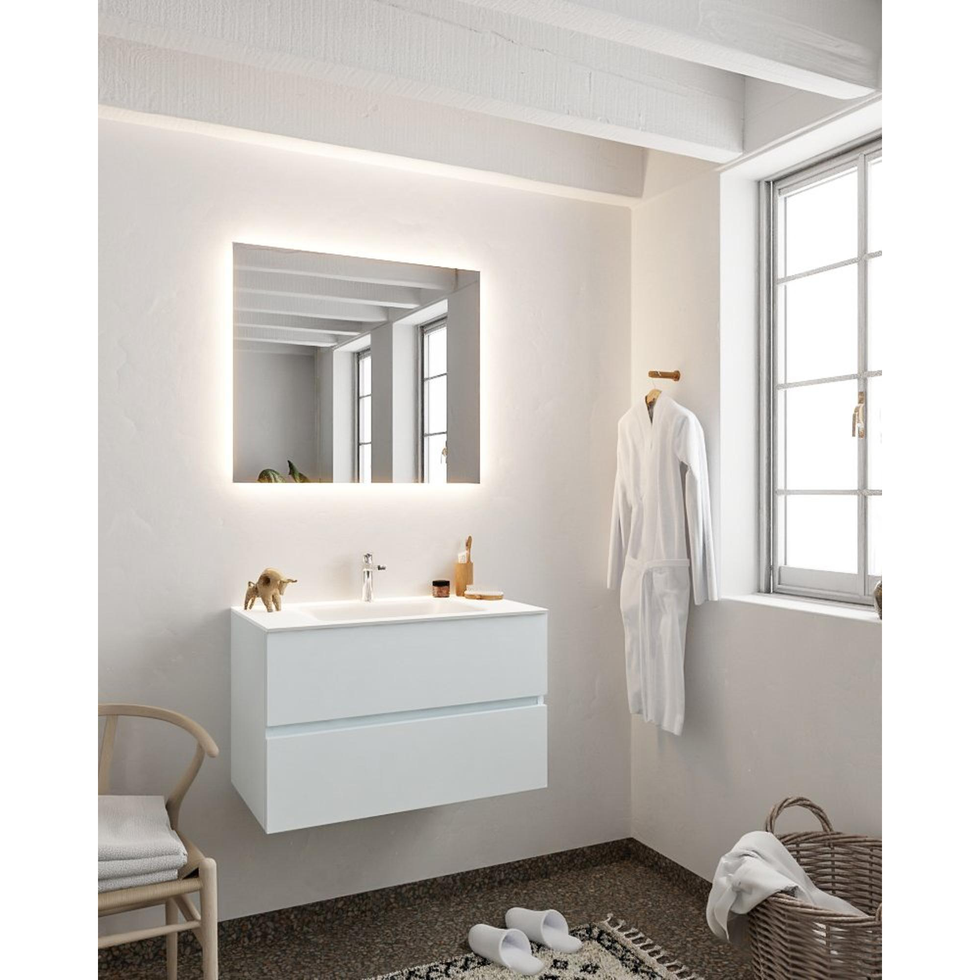 De MONDIAZ VICA Badkamermeubelset is een prachtige toevoeging aan elke badkamer. Met een breedte van 80cm, 2 ruime lades, een wasbak in de kleur Cloud midden en een kraangat, straalt dit meubelstuk elegantie en stijl uit. Gemaakt van hoogwaardig solid surface clay, combineert dit badkamermeubel functionaliteit met een modern design.