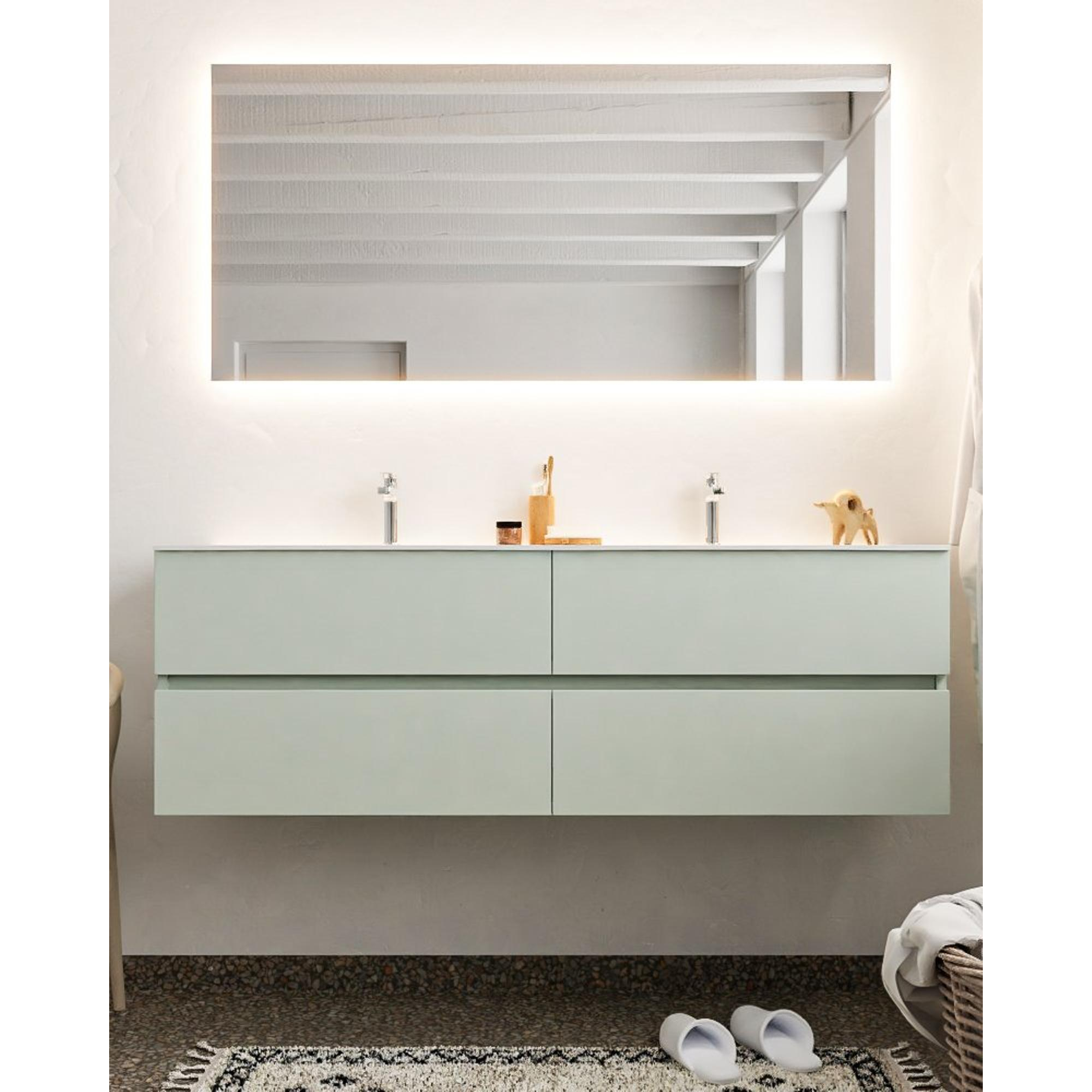 De MONDIAZ VICA badkamermeubelset straalt luxe uit in elke badkamer. Met zijn slanke ontwerp, zachte grijze kleur en hoogwaardige afwerking, voegt dit meubel een vleugje elegantie toe aan de ruimte. De dubbele wasbak met twee kraangaten biedt voldoende ruimte voor dagelijks gebruik, terwijl de vier lades zorgen voor georganiseerde opslag van badkamerbenodigdheden.
