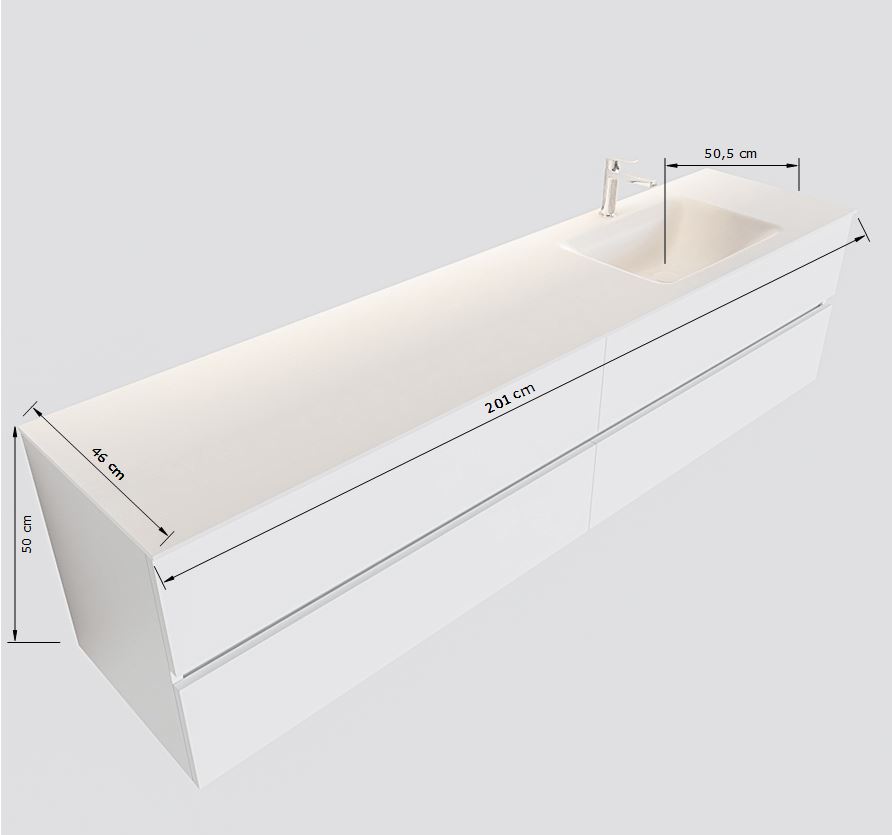 Dit badkamermeubelset straalt luxe uit in elk detail. De gladde afwerking van solid surface in de rustige kleur voegt een vleugje elegantie toe aan je badkamer. De ruime wasbak Cloud aan de rechterkant biedt voldoende ruimte voor dagelijks gebruik en de 4 lades zorgen voor handige opbergruimte voor al je badkamerbenodigdheden. Met dit meubelset geniet je van een luxueuze badkamerervaring.