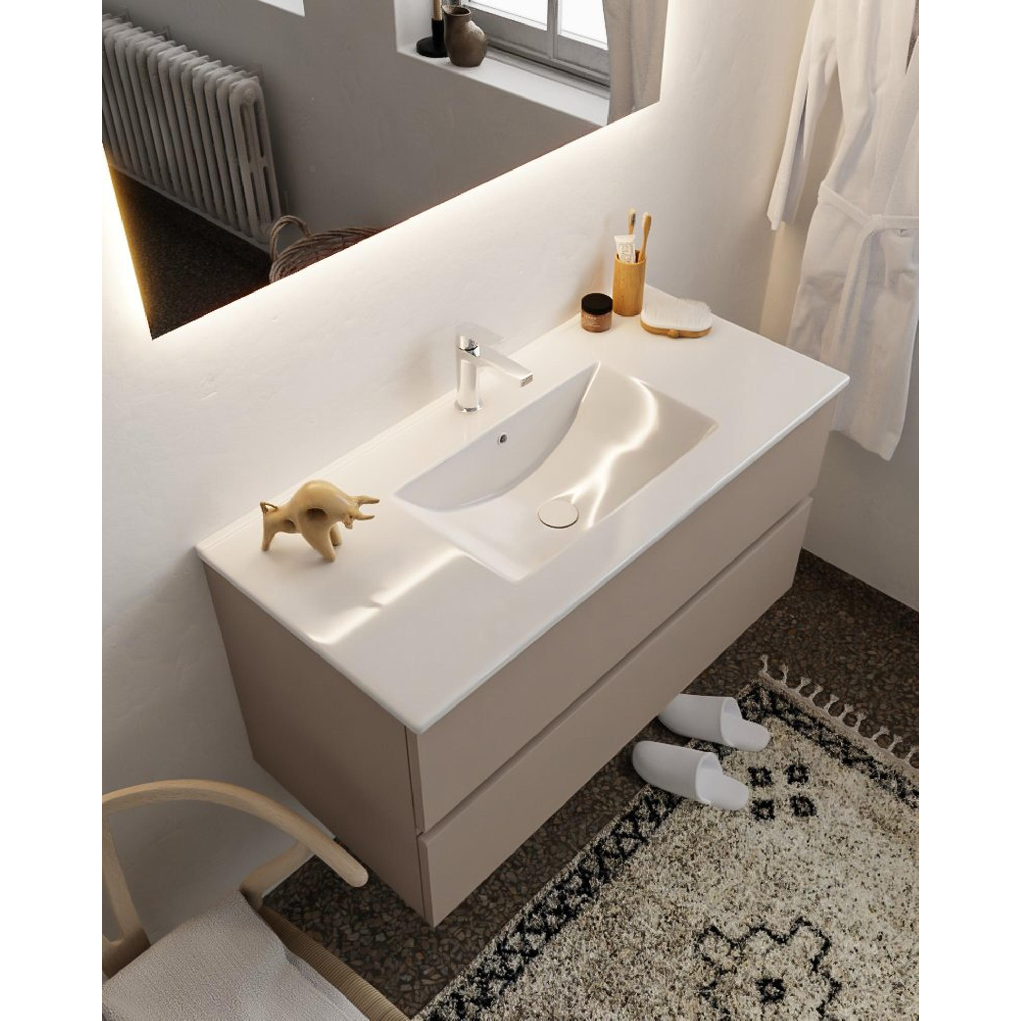 Dit badkamermeubelset is niet alleen mooi, maar ook uiterst functioneel. De 2 ruime lades zijn voorzien van soepele sluitingen en bieden voldoende ruimte om jouw handdoeken, cosmetica en andere benodigdheden netjes op te bergen. Het kraangat is perfect geplaatst voor een eenvoudige installatie van jouw favoriete kraan, terwijl het solide oppervlak duurzaamheid en gemakkelijk onderhoud garandeert.