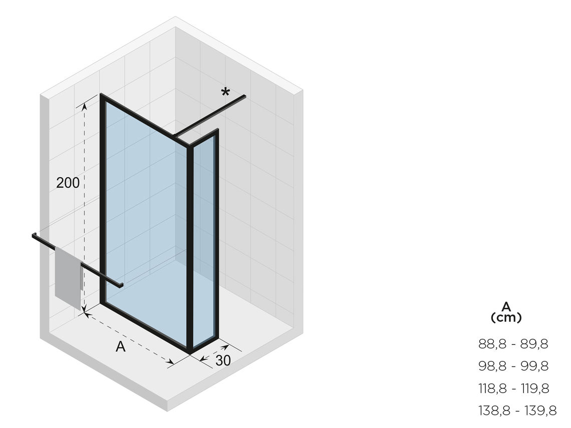 Eenvoudige installatie en flexibele plaatsing Deze inloopdouche is universeel te plaatsen, zowel links als rechts. Dankzij het stelbereik van 988-998 mm kan de wand perfect worden afgesteld, zelfs bij oneffen muren. De meegeleverde stabilisatiestang van 100 cm zorgt voor extra stevigheid, en optioneel zijn langere of schuine stangen verkrijgbaar.