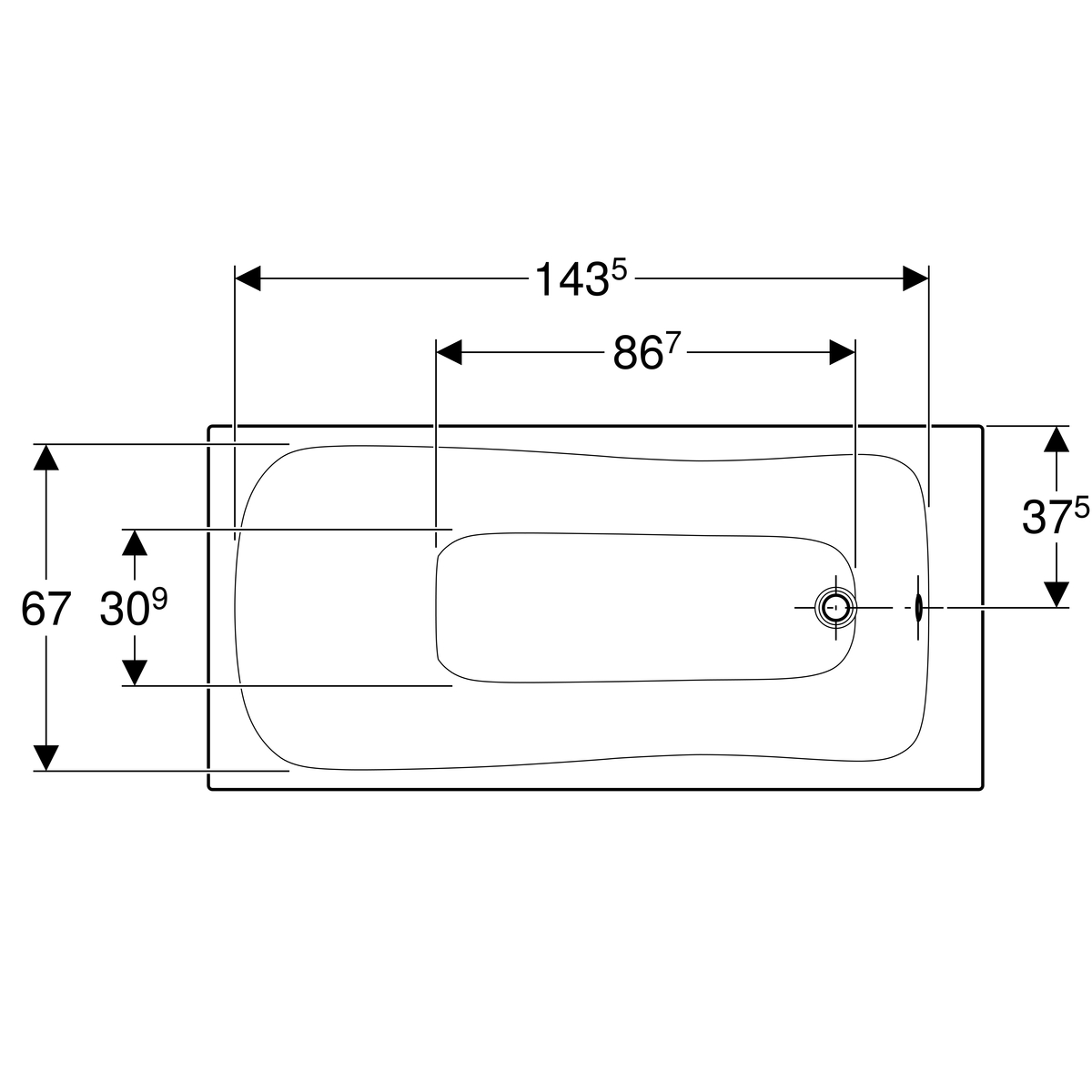De afvoer van het bad zit aan het voeteneind. Vergeet niet om ook een badafvoer te bestellen waarmee je het bad kan afsluiten als je hem vol laat lopen en die voorzien is van een overloop. Het slanke design van de Geberit PushControl overloop past perfect bij dit bad.