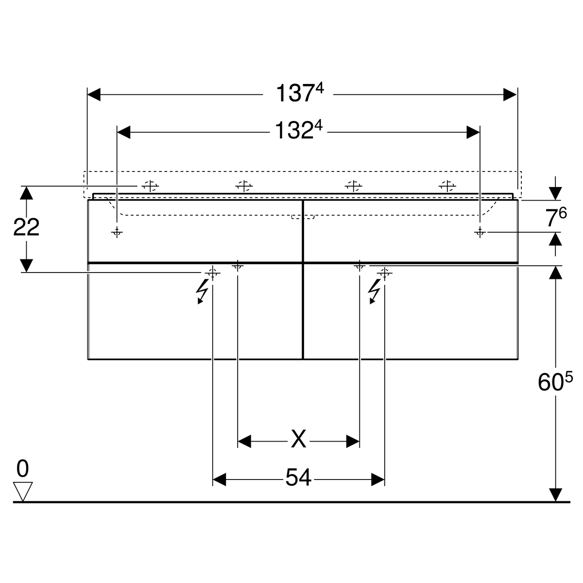 Deze Geberit Xeno2 wastafelonderkast is 137,4cm breed, 53cm hoog en 46,2cm diep.