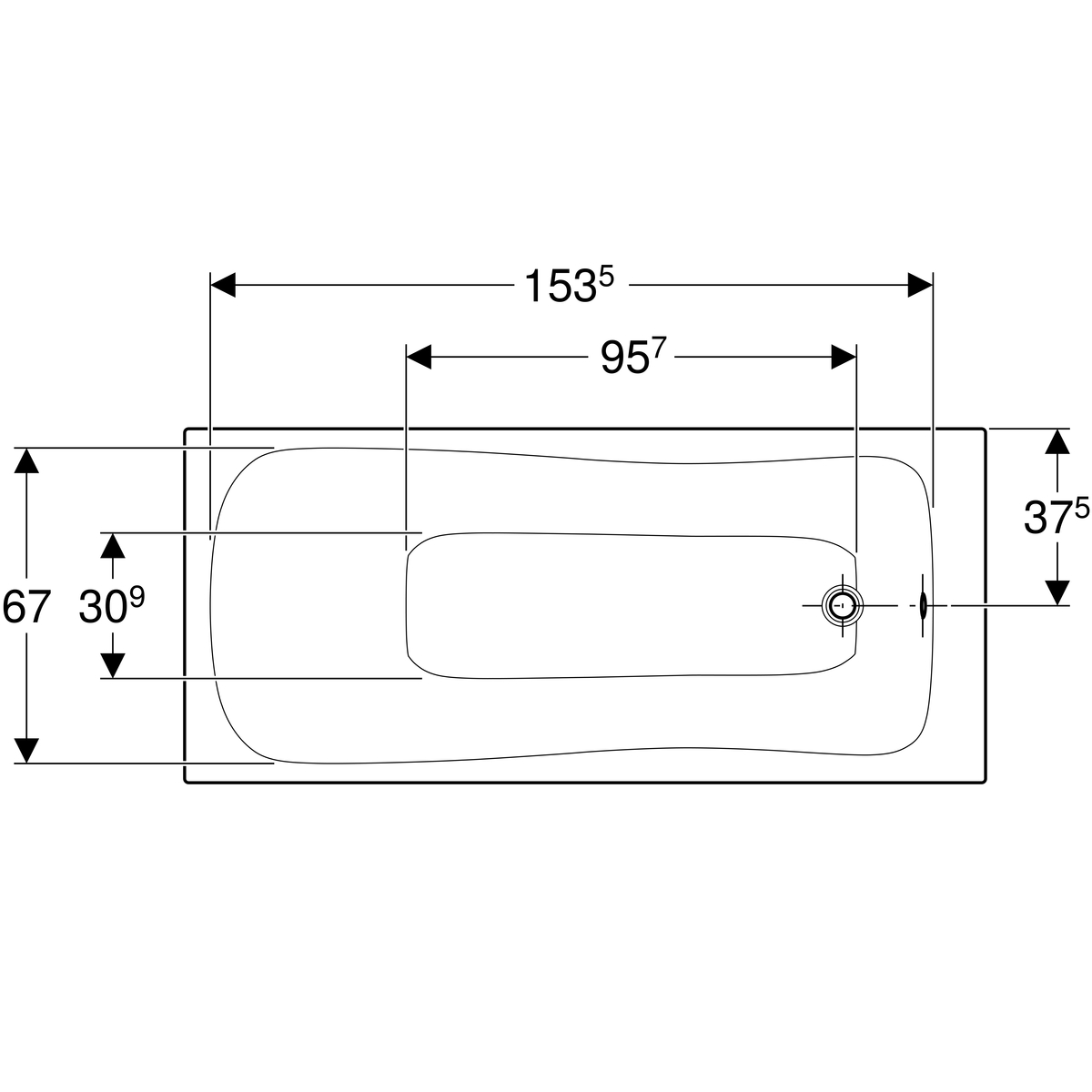 De afvoer van het bad zit aan het voeteneind. Vergeet niet om ook een badafvoer te bestellen waarmee je het bad kan afsluiten als je hem vol laat lopen en die voorzien is van een overloop. Het slanke design van de Geberit PushControl overloop past perfect bij dit bad.