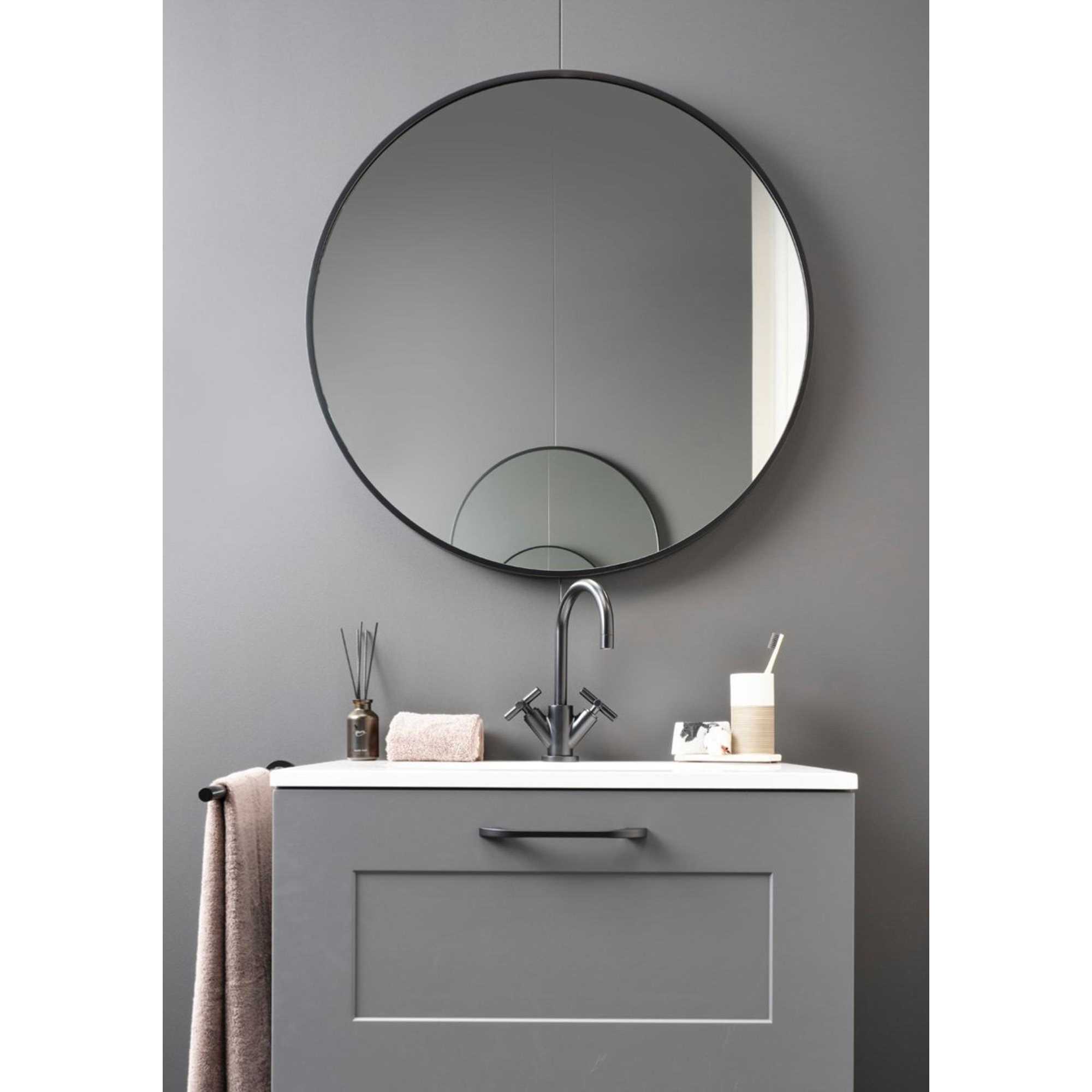 Deze stijlvolle spiegel van Nemo heeft een diameter van 60 cm. Om de juiste grootte van de spiegel te bepalen raden wij aan om het badkamermeubel als referentie te gebruiken. Door dezelfde breedte aan te houden vormen badkamermeubel en spiegel een mooi geheel. Lukt het niet om dezelfde maat spiegel aan te houden dan is ons advies om een iets smallere spiegel te kiezen.