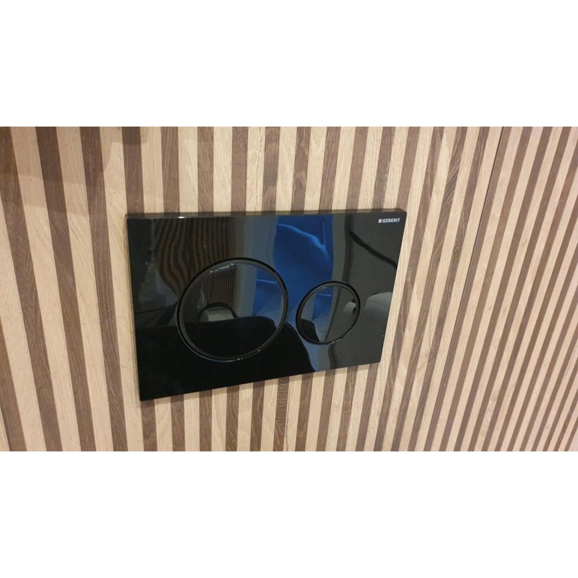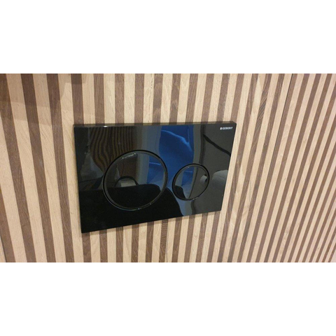 De Geberit sigma20 bedieningsplaat straalt een tijdloze elegantie uit die moeiteloos past bij verschillende badkamerstijlen. De combinatie van de glanzende zwarte plaat en de matte zwarte ring creëert een verfijnde uitstraling die een vleugje luxe toevoegt aan je toilet. De strakke lijnen en het moderne ontwerp maken van deze bedieningsplaat een ware blikvanger in je badkamer.