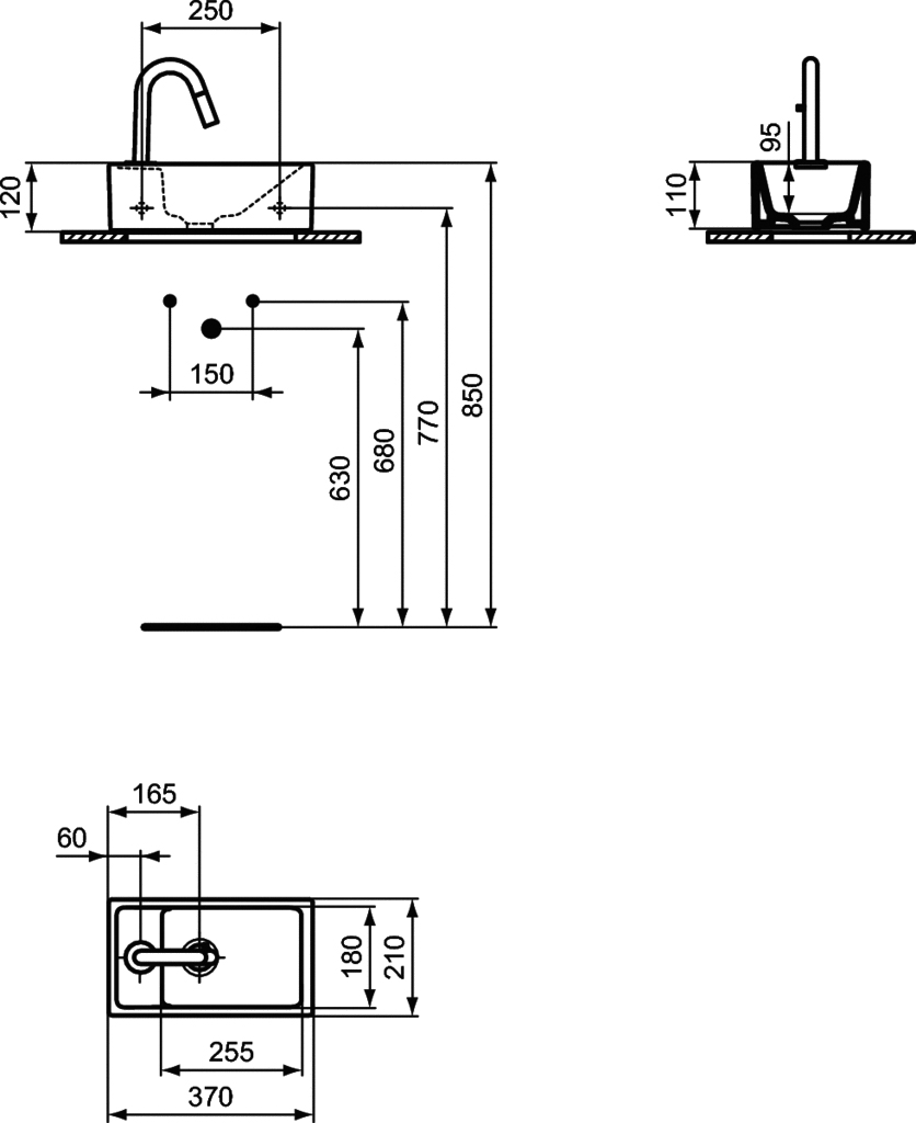 - Tempo fontein 370 x 210 mm van keramiek. 1 kraangat links doorgestoken. Zonder overloop.