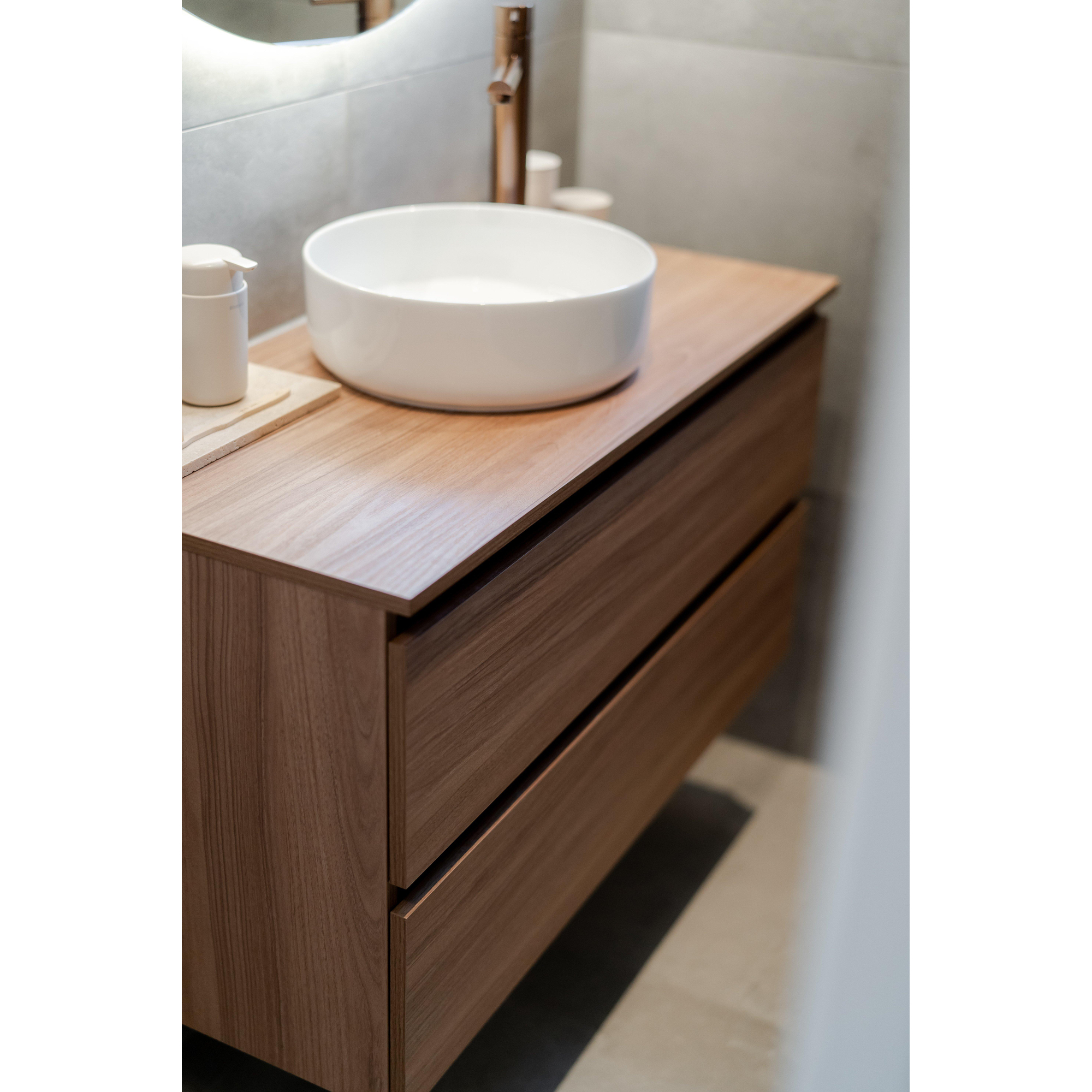De INK Wastafelonderkast straalt een elegante en verfijnde sfeer uit die elke badkamer transformeert. De combinatie van de greeploze lades, houten keerlijst en Zuiver eiken MFC-materiaal creëert een harmonieus geheel dat luxe en comfort uitstraalt. Deze kast voegt niet alleen stijl toe aan de ruimte, maar biedt ook een functionele oplossing voor het opbergen van diverse badkamerartikelen.