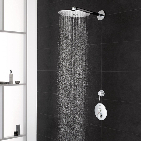 Een fantastische manier om je badkamer te vernieuwen! De GROHE Euphoria 260 SmartControl hoofddouche is voorzien van drie innovatieve straalsoorten waarmee je meteen luxe toevoegt aan je badkamer. De Jet Spray is krachtig en geconcentreerd waardoor hij perfect is om je haar uit te spoelen en om je een stimulerende hoofd- of nekmassage te geven. SmartRain is een bredere straal en zorgt voor een stimulerende, maar tegelijkertijd ontspannende ervaring. De Rain Spray maakt gebruik van alle sproeigaatjes van de royale douchekop voor een verzachtende douche waarbij je lichaam volledig wordt ondergedompeld met water. Om de gewenste straal te kiezen hoef je alleen maar aan de innovatieve SmartControl te draaien die zich in het midden van de douchekop bevindt. Zo simpel is het! Dankzij het slanke profiel en het tijdloze design past hij perfect bij verschillende badkamerstijlen en hij zit ook vol met de technologie van GROHE! GROHE EcoJoy beperkt het water tot 9,5 l/min waardoor je water bespaart, maar wel volledig kunt genieten van je douche. GROHE DreamSpray verdeelt het water gelijkmatig over ieder sproeigaatje – welke straal je ook kiest – voor een wonderbaarlijke douche die bij jouw stemming past. De glanzende, krasbestendige GROHE StarLight chroomlaag gaat jarenlang mee en je kunt de kalk op de SpeedClean sproeigaatjes eenvoudig wegvegen. Hij is eenvoudig te installeren en de Inner WaterGuide voorkomt dat het oppervlak te heet wordt en beschermt zowel je huid als de chroomafwerking. De GROHE Euphoria 260 SmartControl hoofddouches – voor ontspanning en stimulatie!