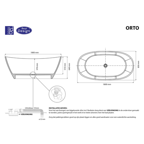 Best Design Orto vrijstaand bad 180x85x64cm inclusief sifon solid surface wit mat