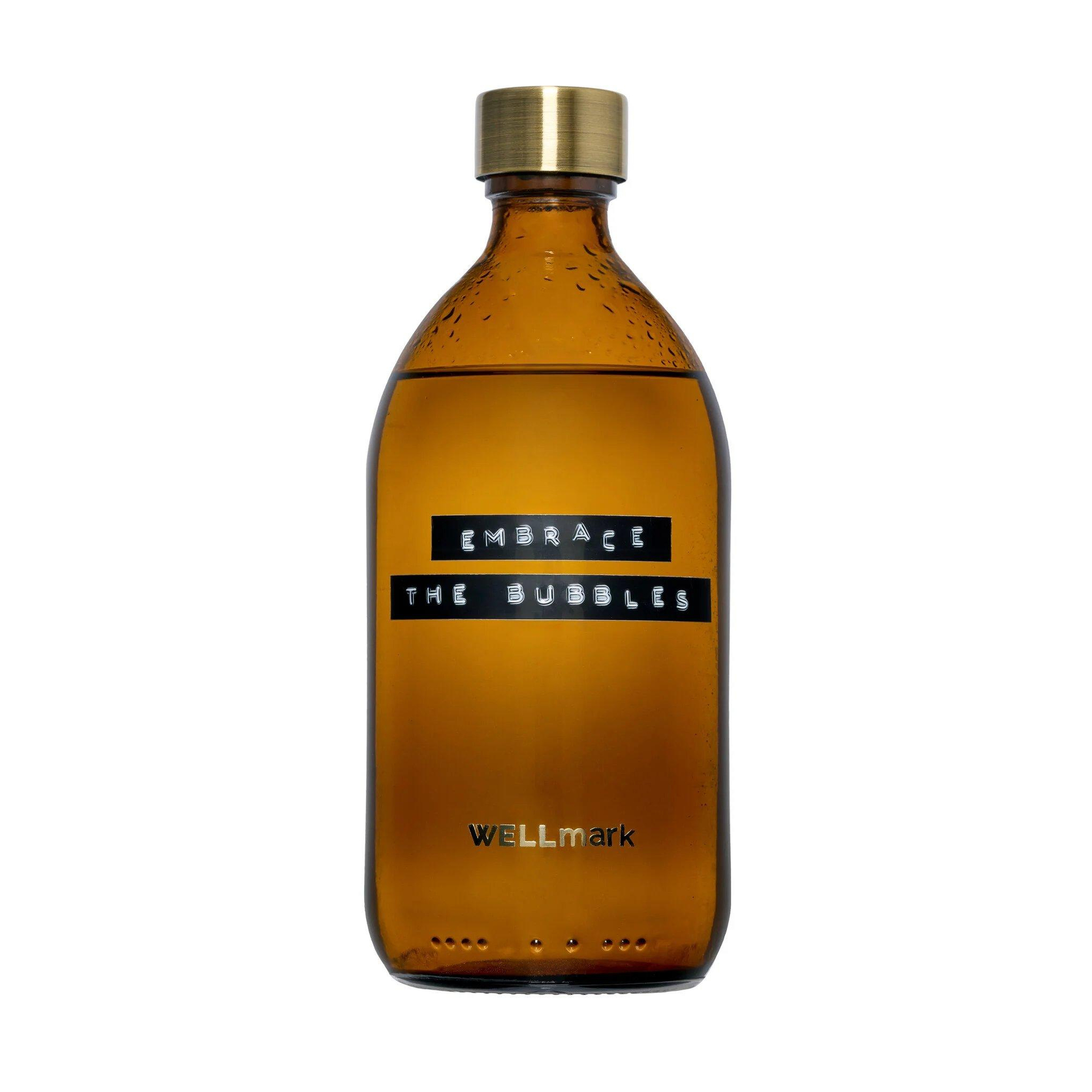 Het oog wil ook wat! Daarom heeft Wellmark een glazen fles ontworpen, welke een echte ‘eyecatcher’ is in jouw badkamer. De apothekersfles heeft een vintage uitstraling terwijl de gouden stalen dop en de leuke tekst hem weer helemaal van nu maakt! Wellmark wil hun producten iets extra’s geven om te koesteren, namelijk een persoonlijk detail. Daarom luidt de tekst op deze fles, EMBRACE THE BUBBLES