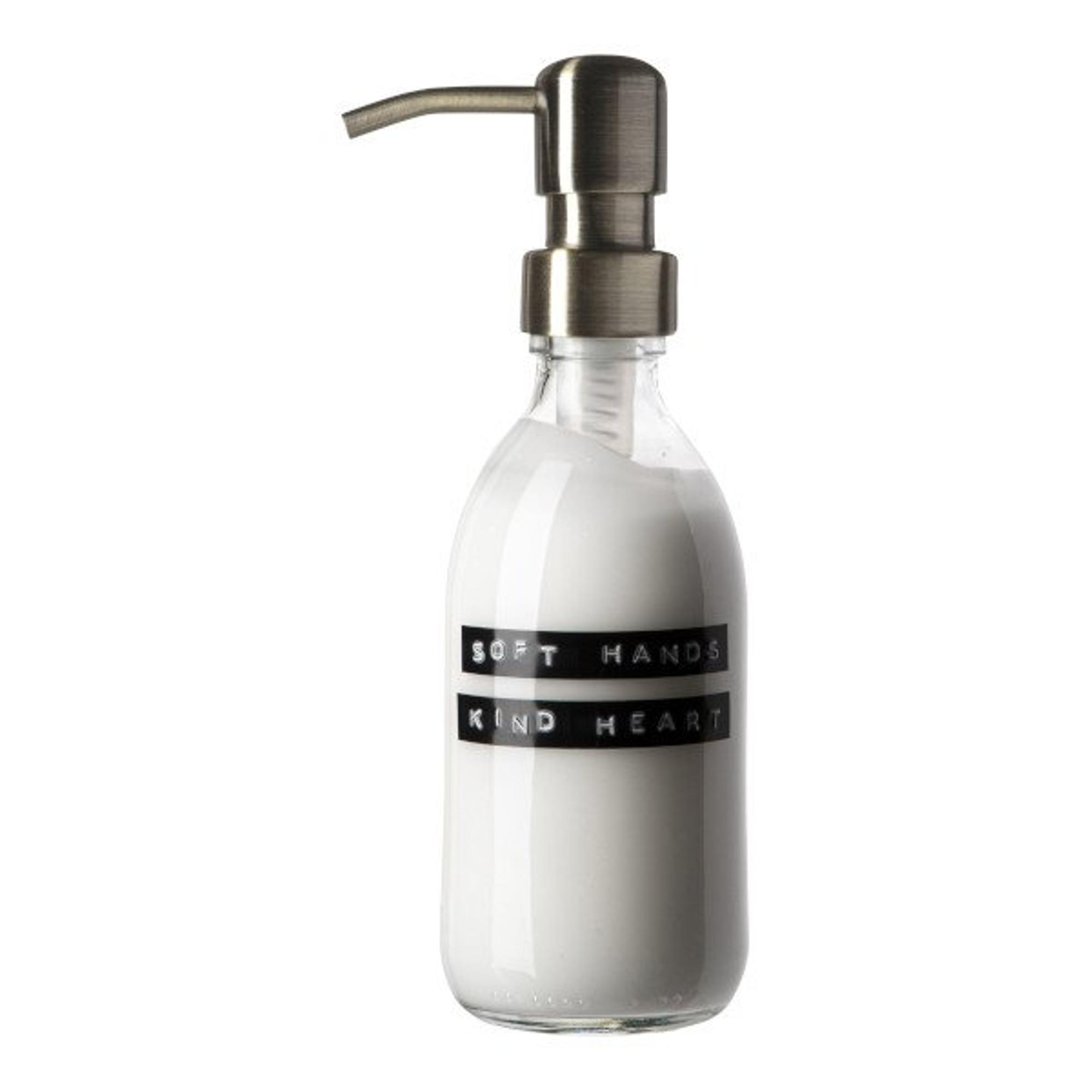 Wellmark Handcreme helder glas messing pomp 250ml tekst SOFT HANDS KIND HEART