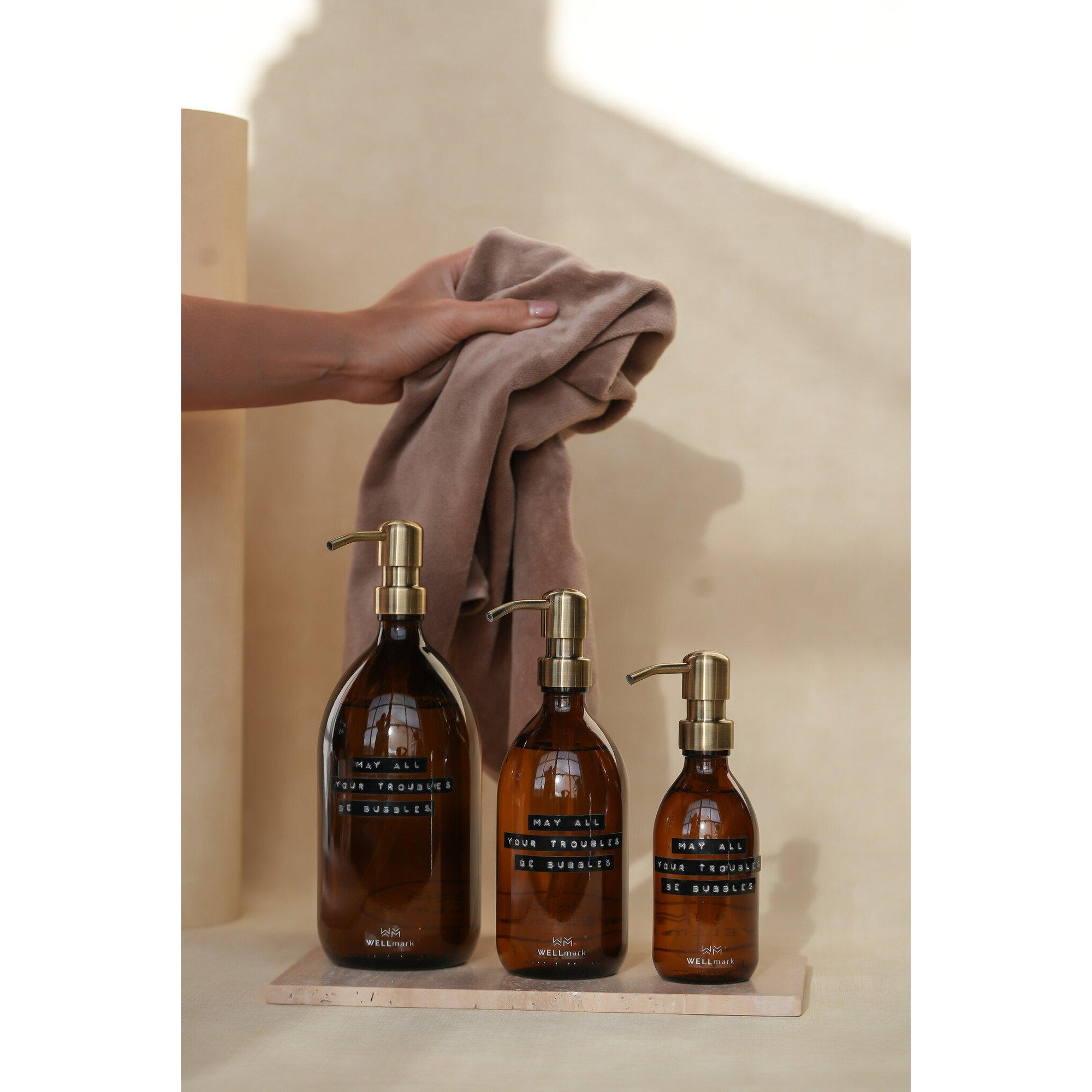 Wellmark Handzeep bruin glas messing pomp 1000ml tekst MAY ALL YOUR TROUBLES BE BUBBLES