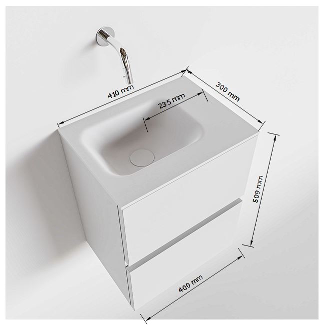 Dit toiletmeubel is niet alleen mooi, maar ook zeer functioneel. Met twee ruime lades biedt het voldoende opbergruimte voor al je badkamerbenodigdheden. De Solid surface wasbak is duurzaam en gemakkelijk schoon te maken, waardoor het onderhoud van dit meubelstuk een fluitje van een cent is. De afmetingen van 40x30x50cm maken het perfect voor zowel kleine als grotere badkamers.