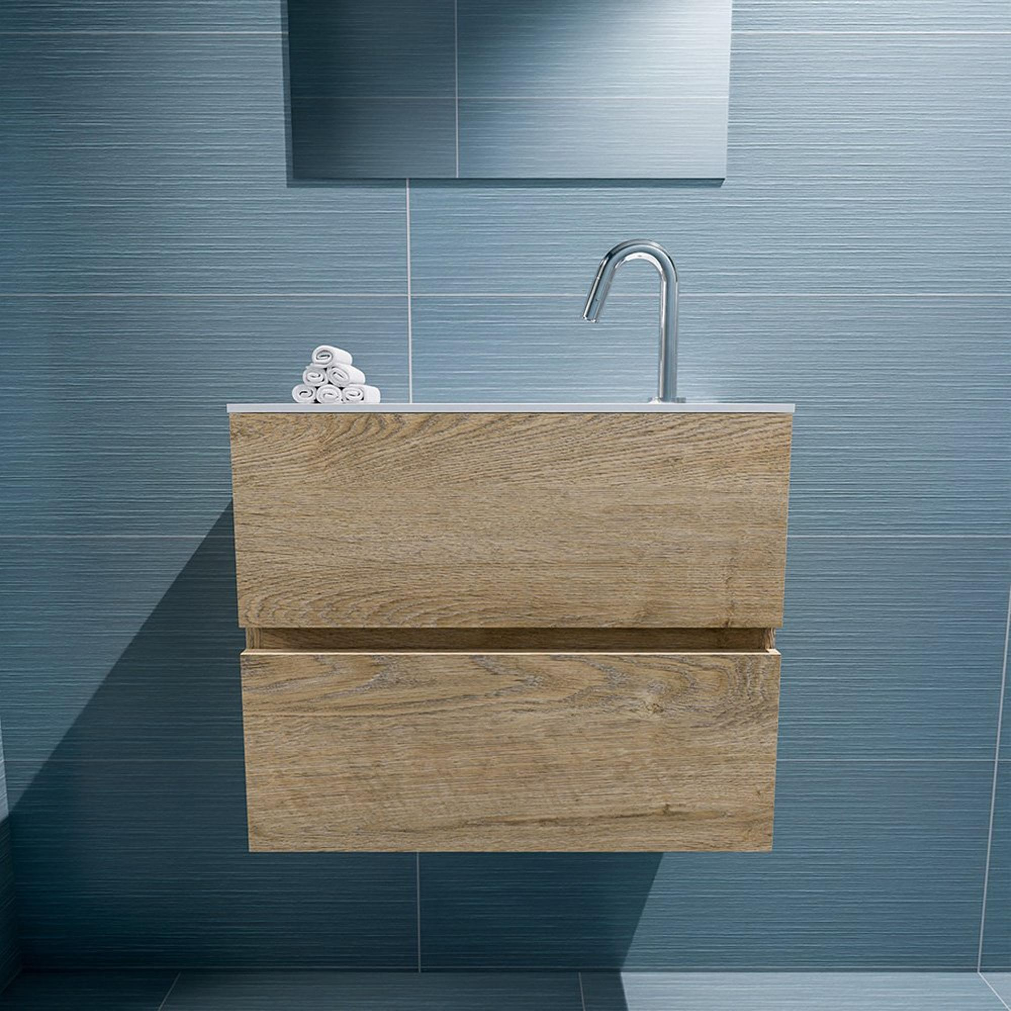 MONDIAZ ADA Toiletmeubel - 60x30x50cm - 1 kraangat - 2 lades - washed oak mat - wasbak midden - Solid surface - Wit