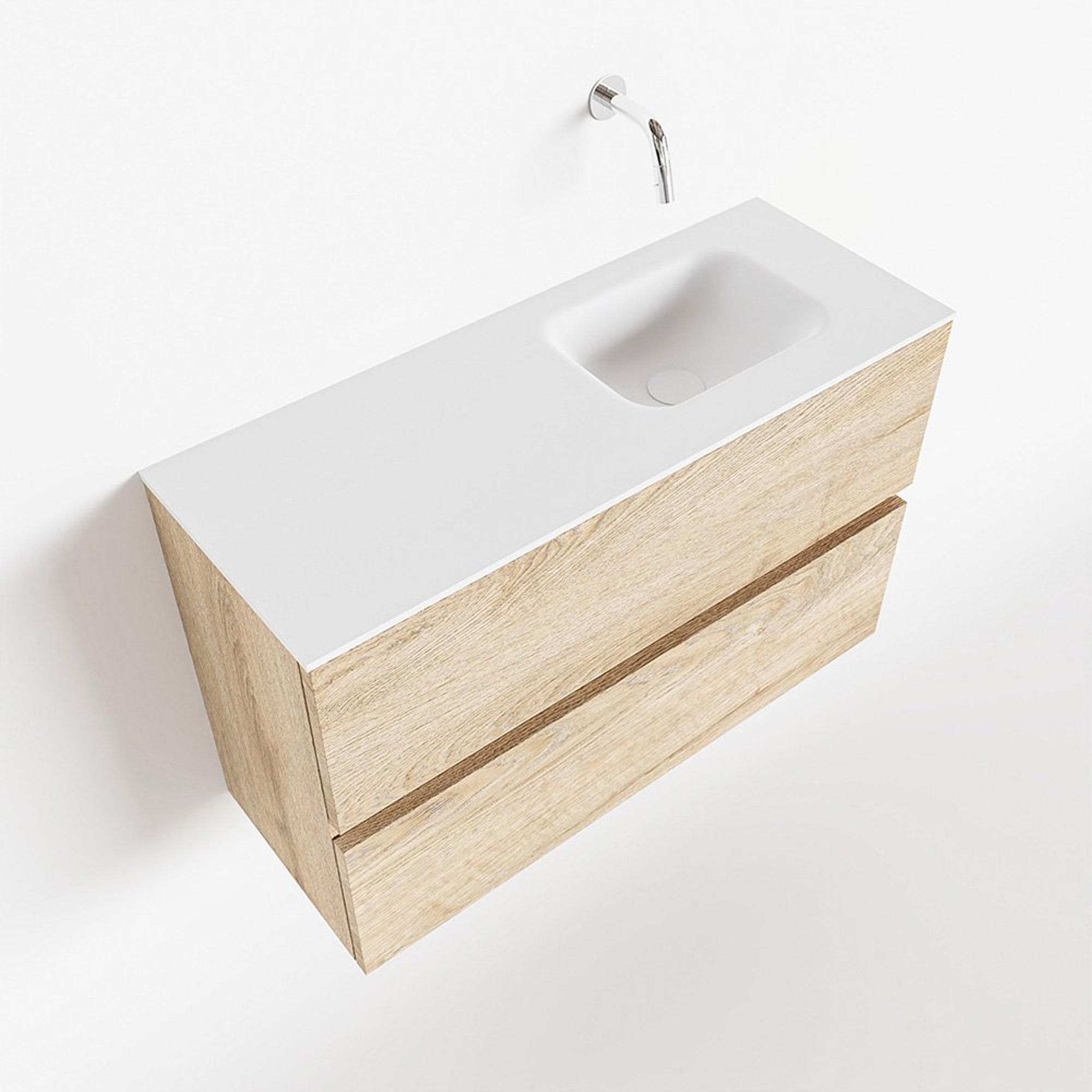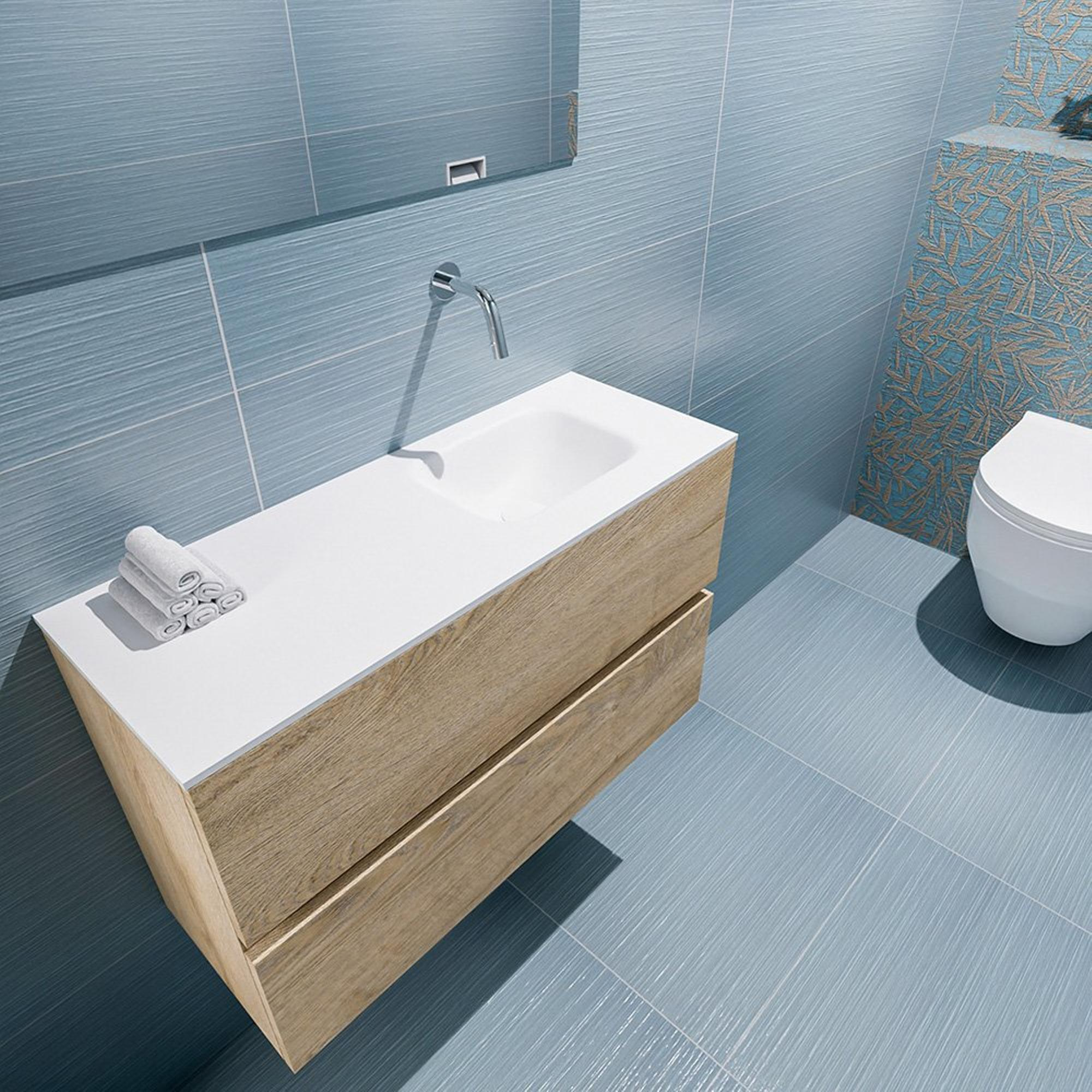 MONDIAZ ADA Toiletmeubel - 80x30x50cm - 0 kraangaten - 2 lades - washed oak mat - wasbak rechts - Solid surface - Wit