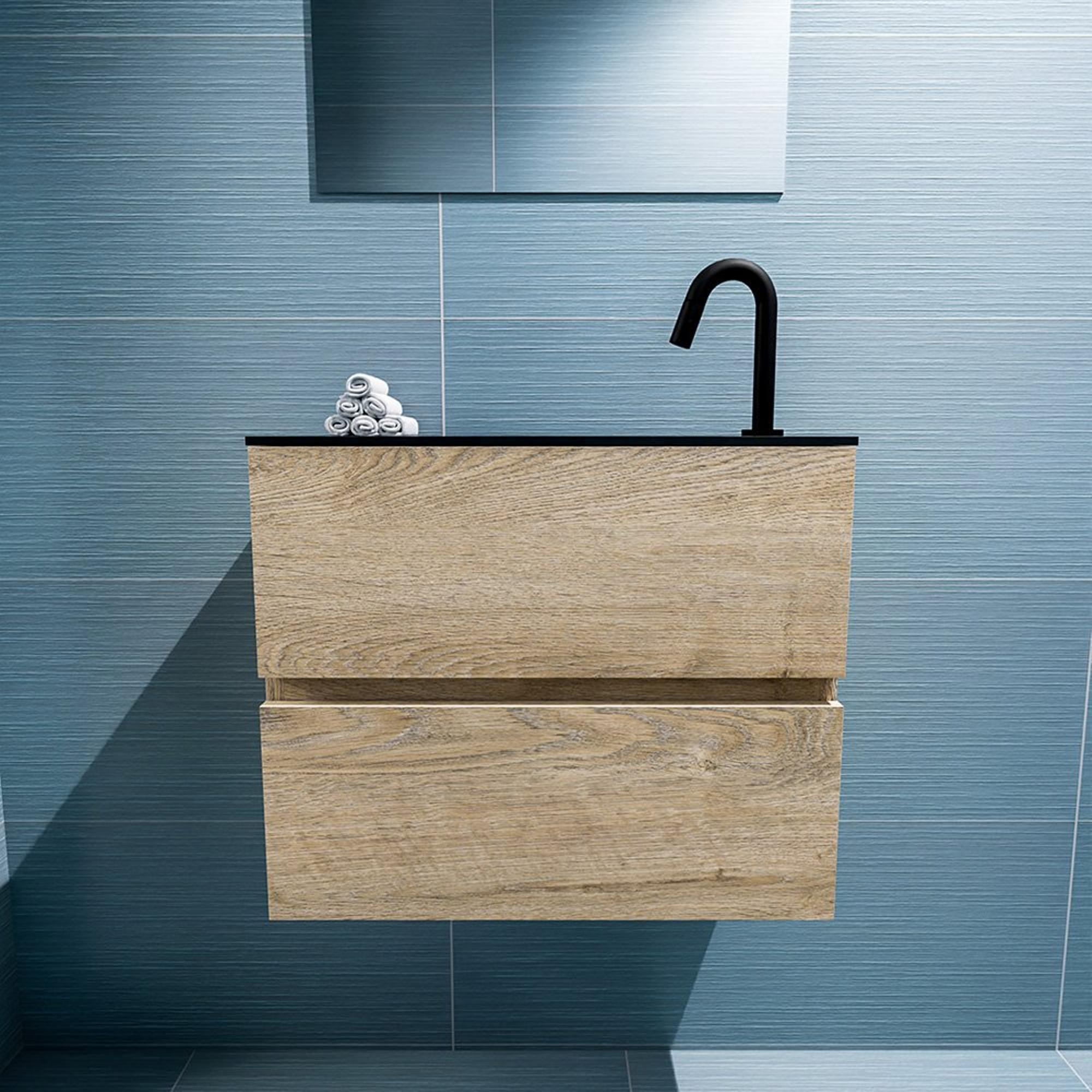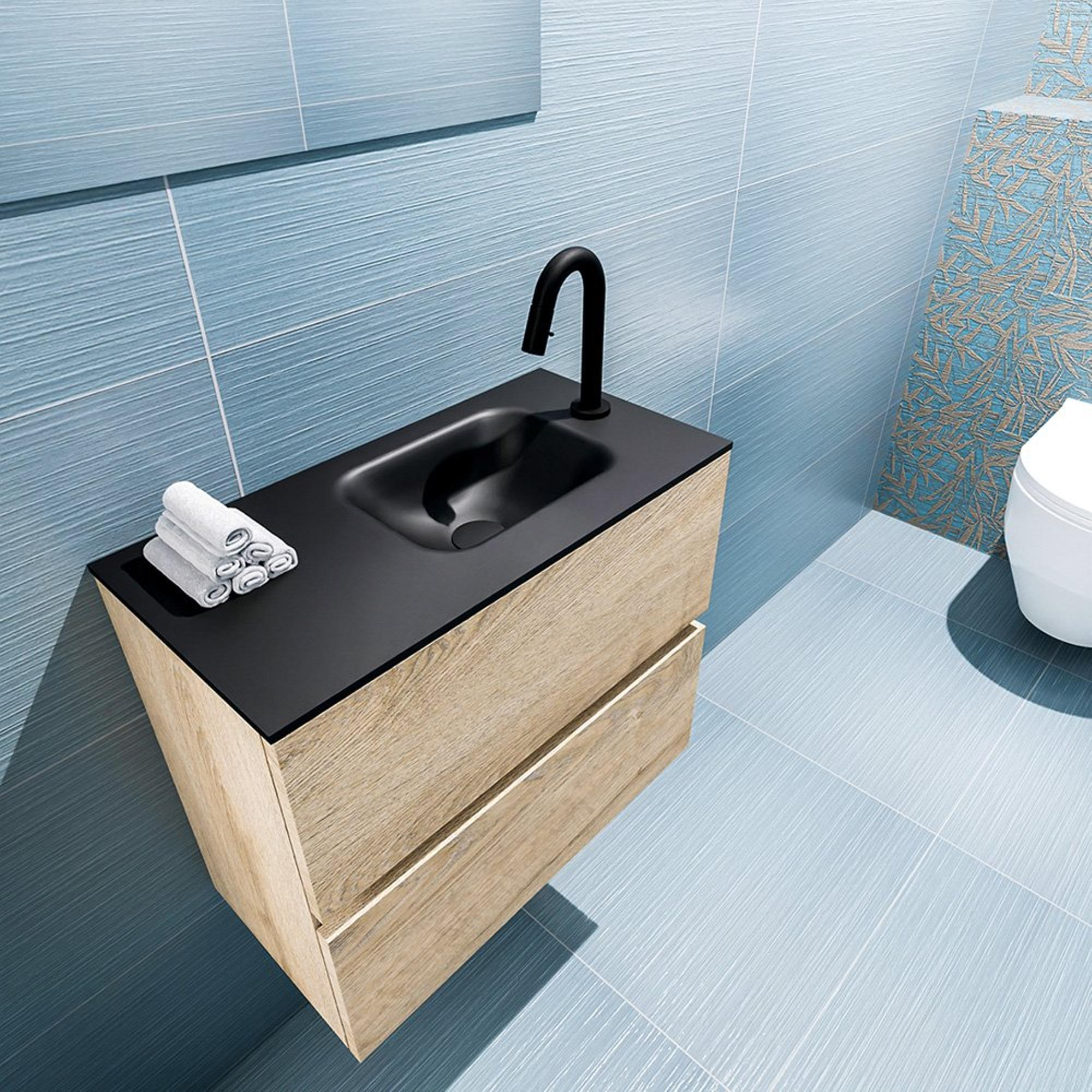 MONDIAZ ADA Toiletmeubel - 60x30x50cm - 1 kraangat - 2 lades - washed oak mat - wasbak rechts - Solid surface - Zwart