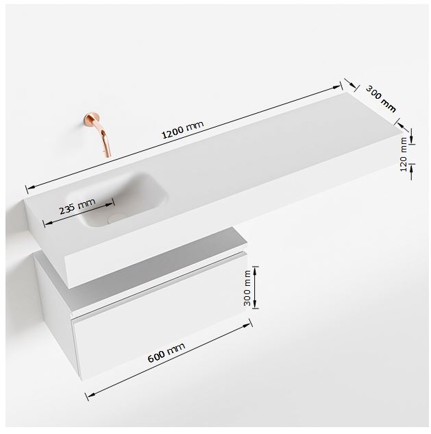 Het toiletmeubel is ontworpen met praktisch gebruik in gedachten. Met een handige lade en een kraangat biedt dit meubel voldoende opbergruimte voor toiletartikelen en handdoeken. De wasbak aan de linkerkant zorgt voor een efficiënte indeling van de ruimte en maakt het gemakkelijk om de wastafel te gebruiken. Het Solid Surface materiaal is niet alleen duurzaam, maar ook gemakkelijk schoon te maken, waardoor het onderhoud van het meubelstuk eenvoudig is.