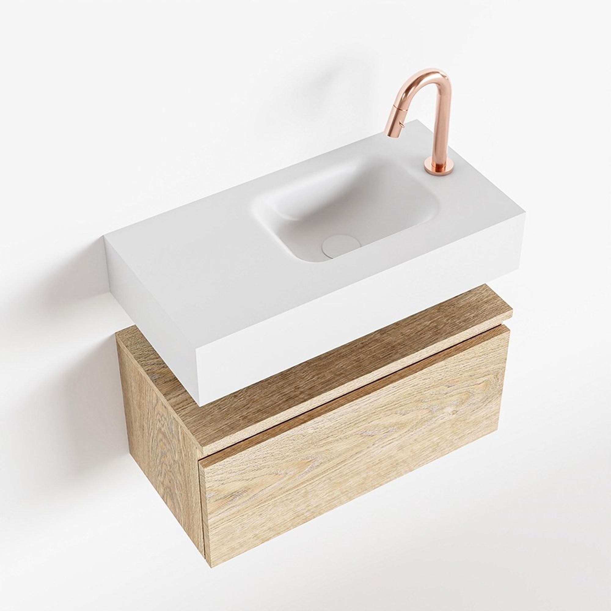 MONDIAZ ANDOR Toiletmeubel - 60x30x30cm - 1 kraangat - 1 lades - washed oak mat - wasbak rechts - Solid surface - Wit