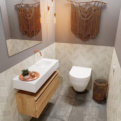 Naast zijn esthetische waarde is dit toiletmeubel ook zeer functioneel. Met 1 lade biedt het voldoende ruimte om je badkamer georganiseerd te houden. De wasbak aan de rechterkant zorgt voor een handige indeling en maakt efficiënt gebruik van de beschikbare ruimte. Dit meubel combineert dus stijl met functionaliteit op een perfecte manier.