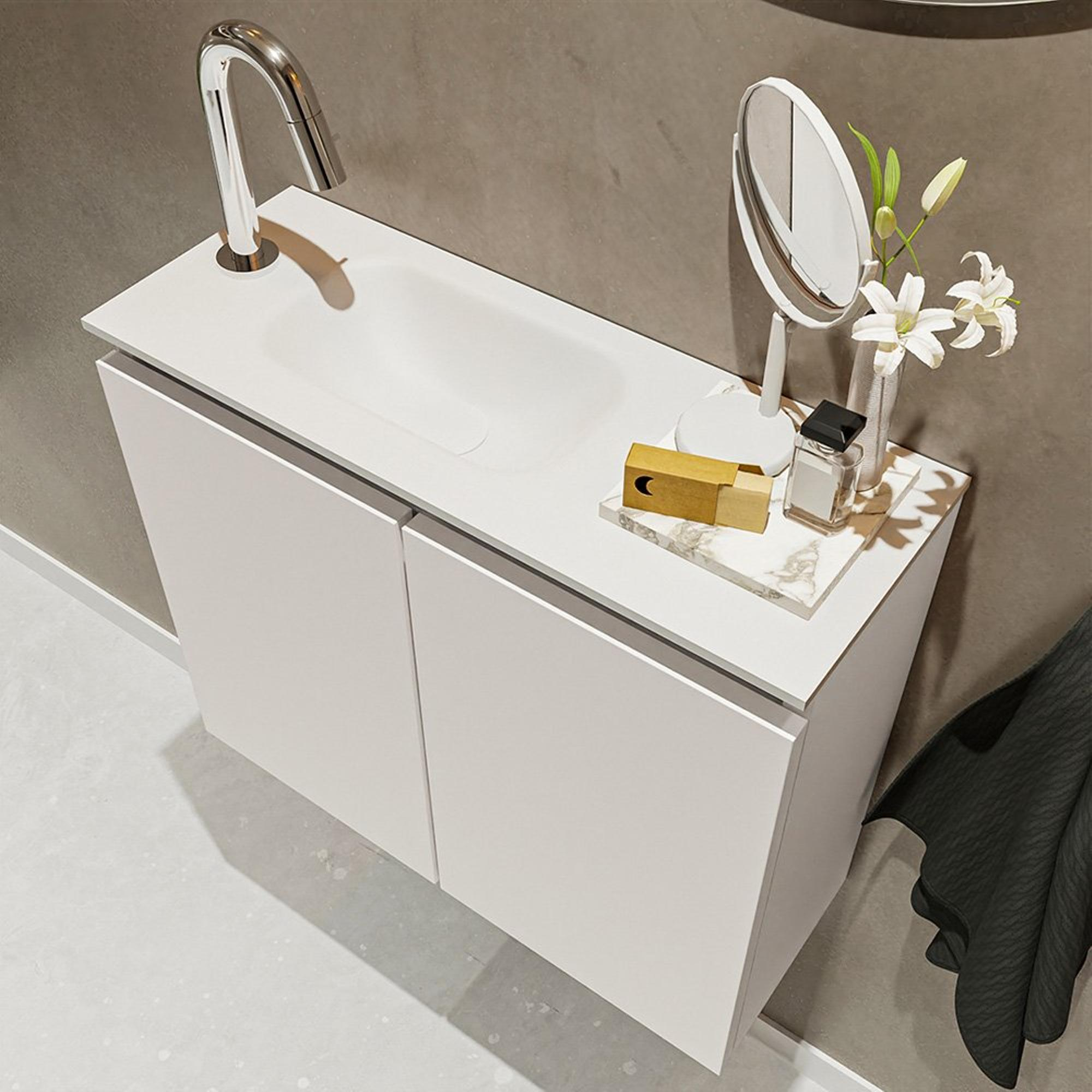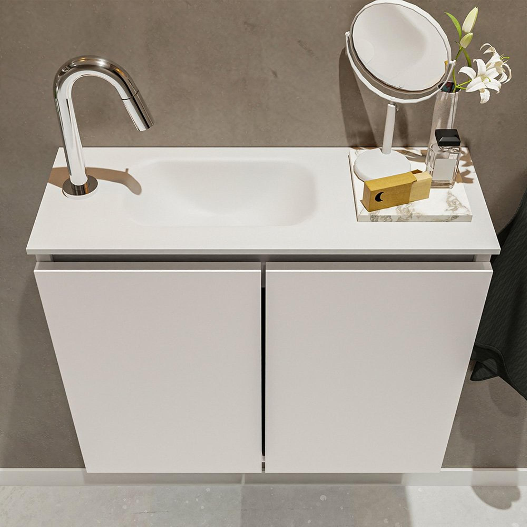 MONDIAZ TURE Fonteinset - 60x23x50cm - 1 kraangat - 2 deuren - linen mat - Wasbak links - Solid Surface Wit