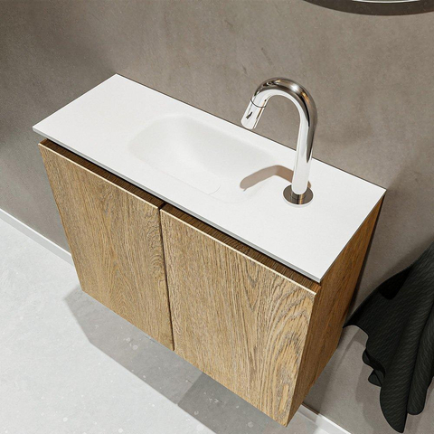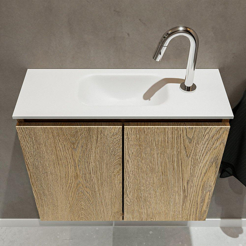 MONDIAZ TURE Fonteinset - 60x23x50cm - 1 kraangat - 2 deuren - washed oak mat - Wasbak midden - Solid Surface Wit