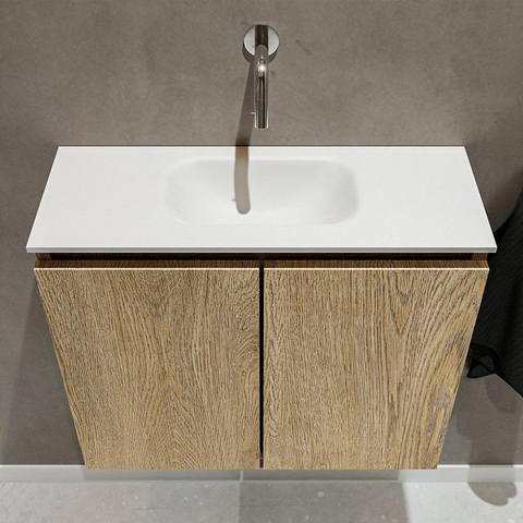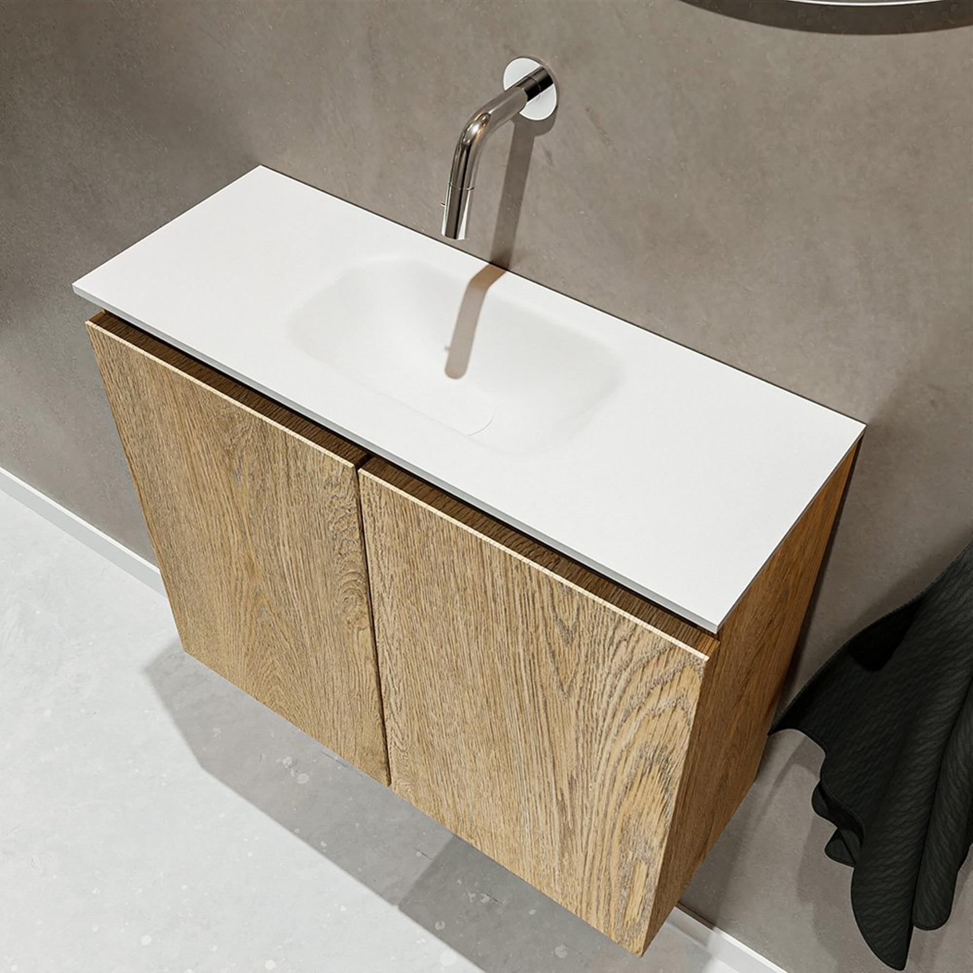 MONDIAZ TURE Fonteinset - 60x23x50cm - 0 kraangaten - 2 deuren - washed oak mat - Wasbak midden - Solid Surface Wit