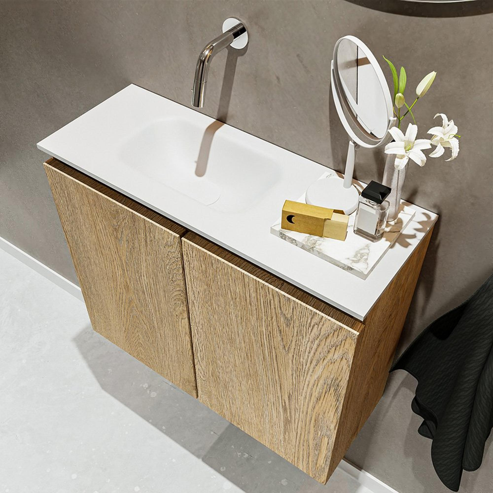 MONDIAZ TURE Fonteinset - 60x23x50cm - 0 kraangaten - 2 deuren - washed oak mat - Wasbak links - Solid Surface Wit