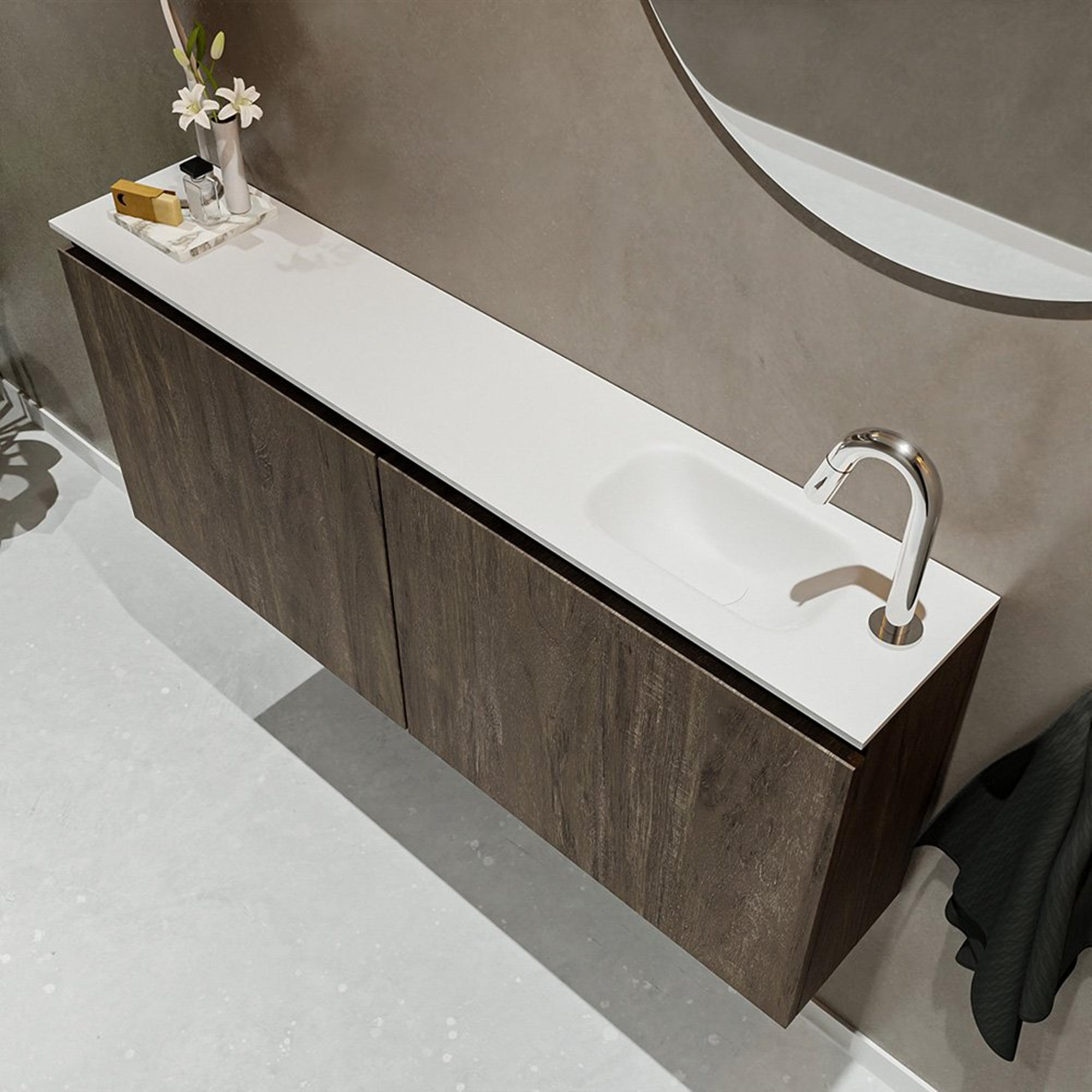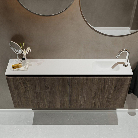 MONDIAZ TURE Fonteinset - 120x23x50cm - 1 kraangat - 2 deuren - dark brown mat - Wasbak rechts - Solid Surface Wit