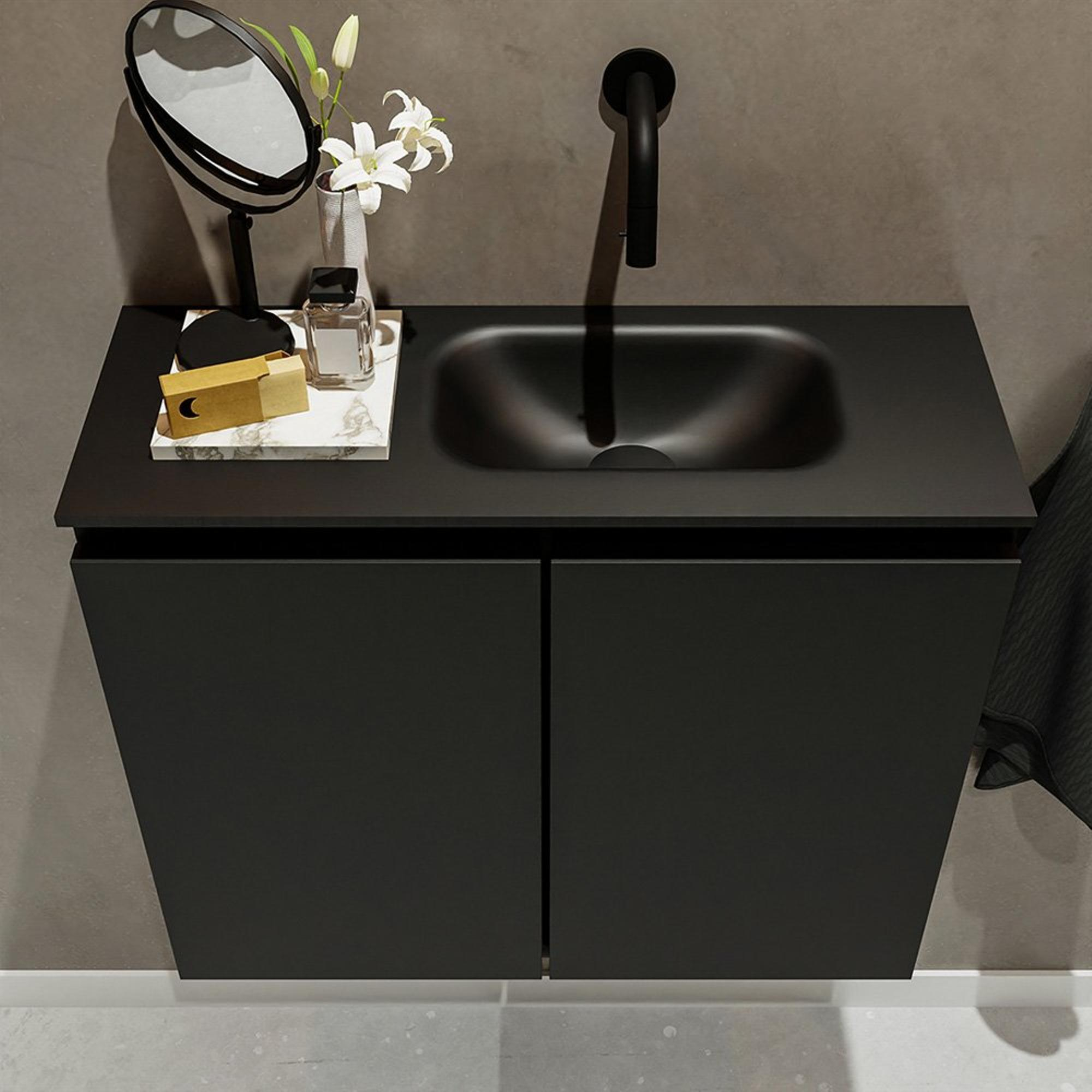MONDIAZ TURE Fonteinset - 60x23x50cm - 0 kraangaten - 2 deuren - urban mat - Wasbak rechts - Solid Surface Zwart