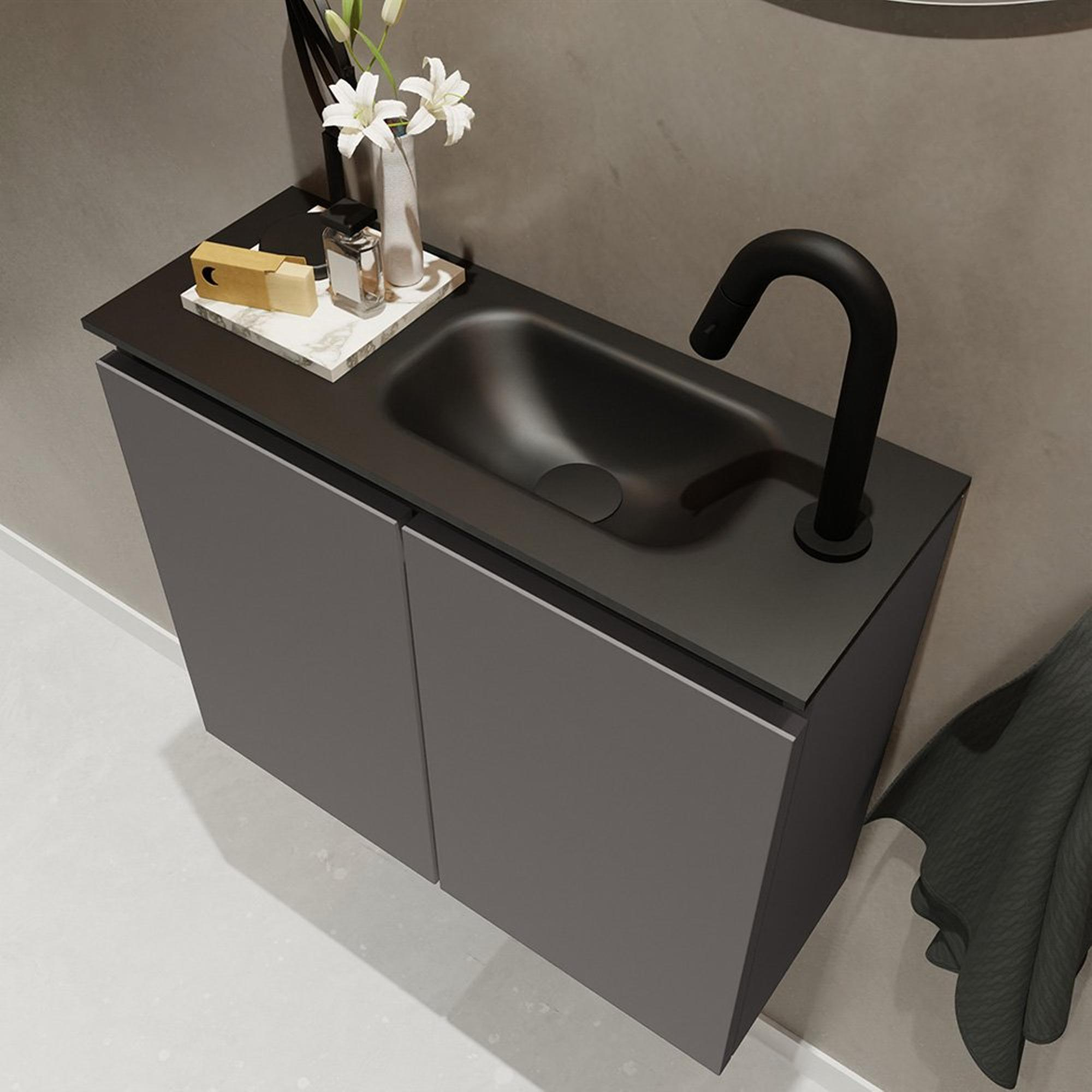 MONDIAZ TURE Fonteinset - 60x23x50cm - 1 kraangat - 2 deuren - darkgrey mat - Wasbak rechts - Solid Surface Zwart