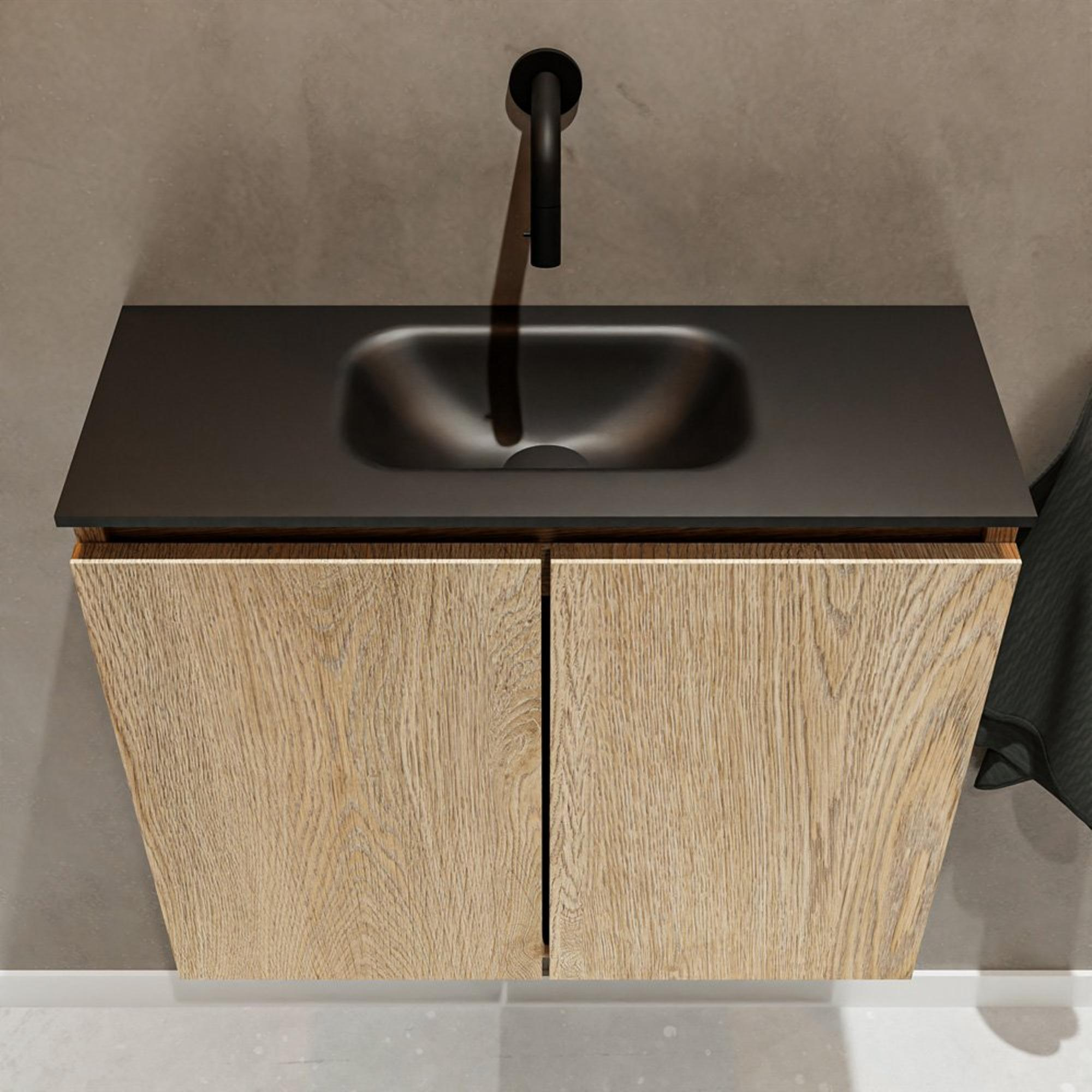MONDIAZ TURE Fonteinset - 60x23x50cm - 0 kraangaten - 2 deuren - washed oak mat - Wasbak midden - Solid Surface Zwart