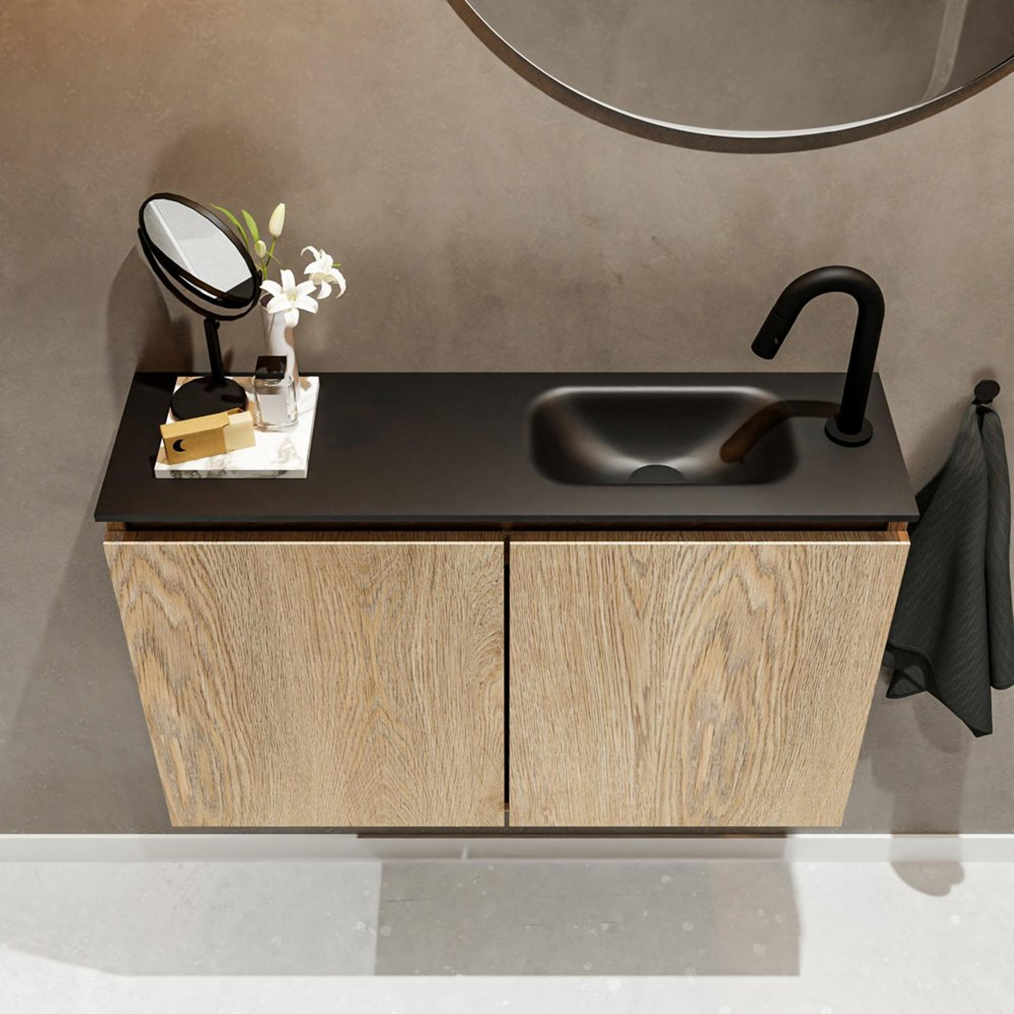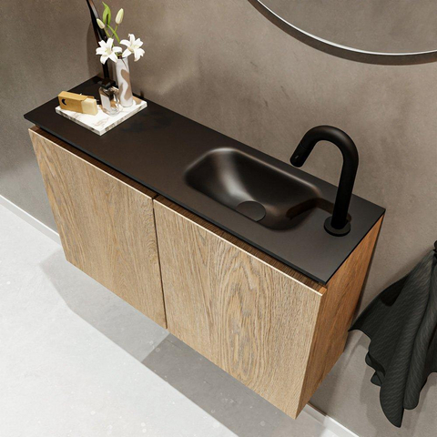 MONDIAZ TURE Fonteinset - 80x23x50cm - 1 kraangat - 2 deuren - washed oak mat - Wasbak rechts - Solid Surface Zwart