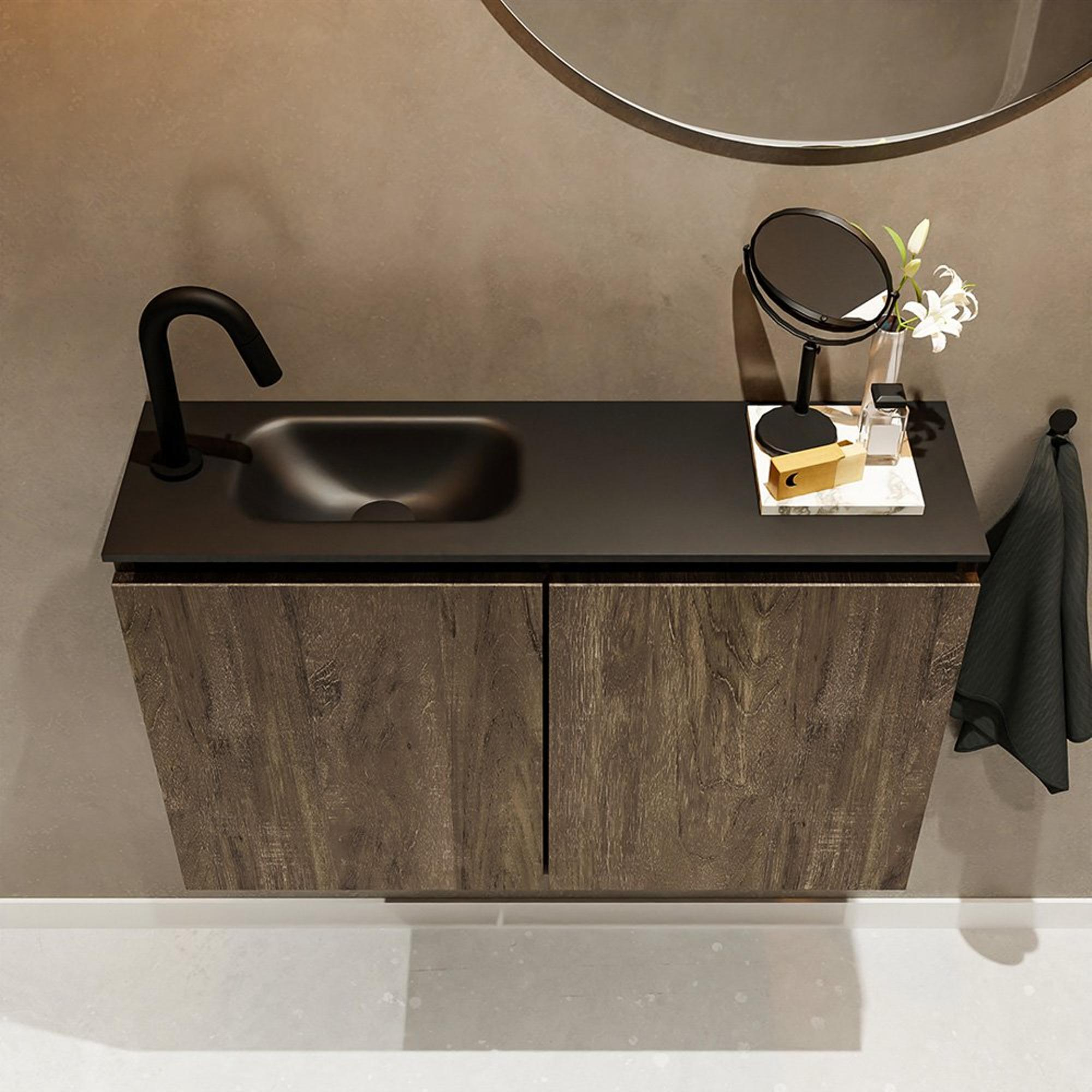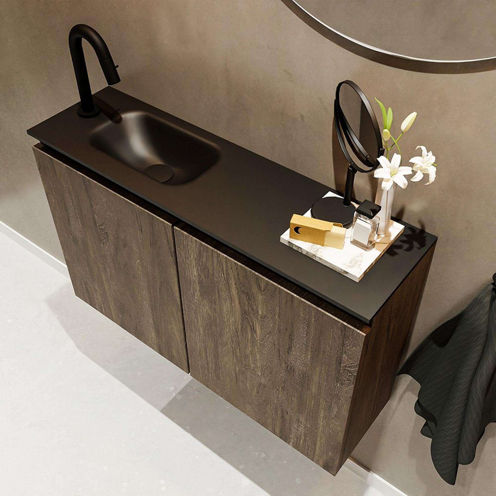 MONDIAZ TURE Fonteinset - 80x23x50cm - 1 kraangat - 2 deuren - dark brown mat - Wasbak links - Solid Surface Zwart