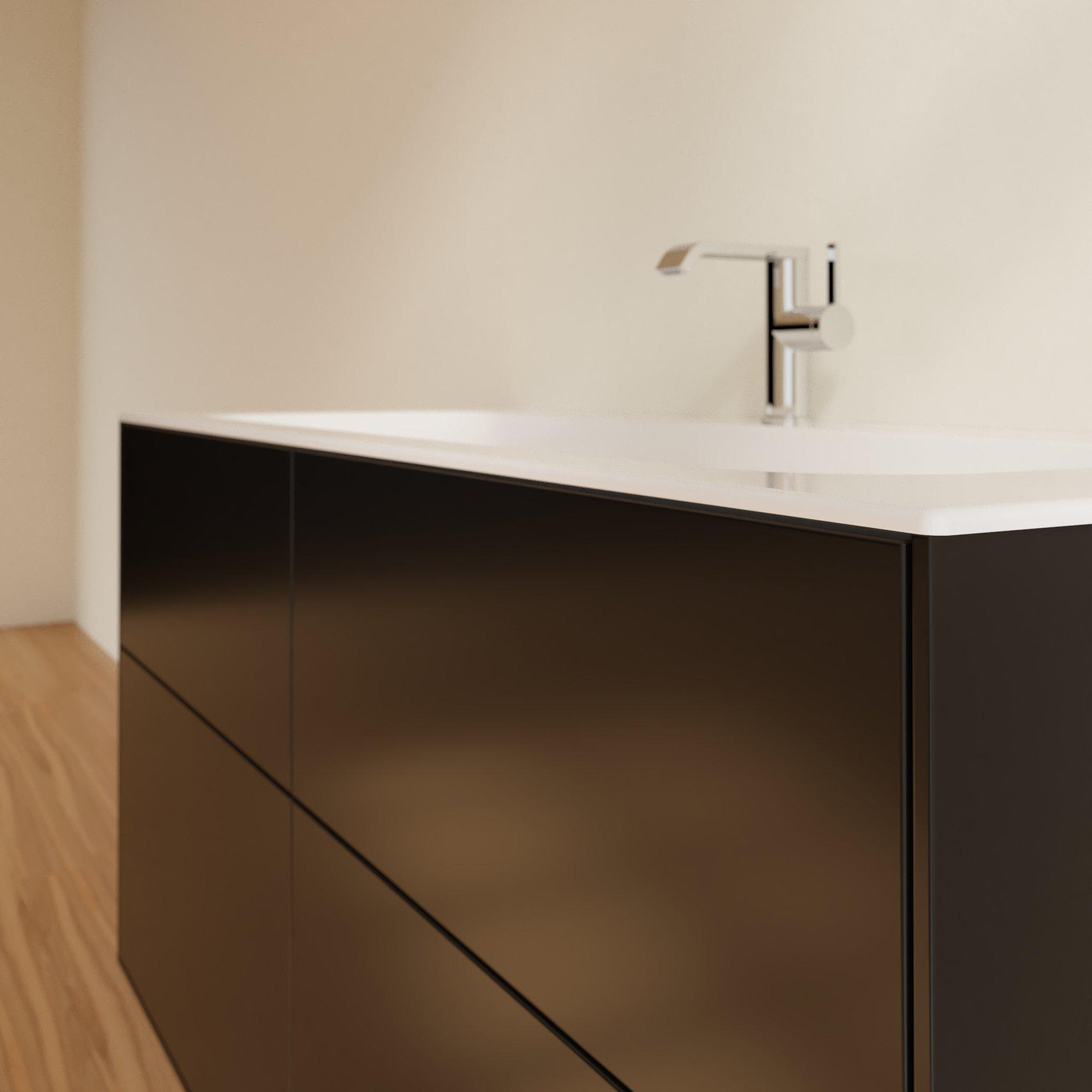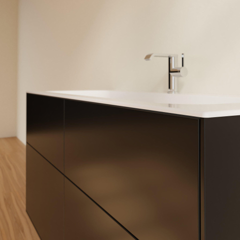 Expressief design en geraffineerde techniek – de Finion wastafelonderkast van Villeroy & Boch overtuigt over de gehele linie. Hij combineert royale opbergruimte met een gezellige sfeer dankzij sfeervolle, dimbare LED-wandverlichting. De vier greeploze lades kunnen dankzij Push-to-Open-technologie en het zelfsluitsysteem heel eenvoudig worden geopend en gesloten. Binnenin zorgen verstelbare glazen scheidingswandjes, meerdere accessoireboxen voor badkamerbenodigdheden en antislipbodems voor een individueel organisatiesysteem en optimaal comfort. Het meerlaags gelakte oppervlak zorgt voor een hoogwaardige afwerking en uitstraling van het meubel.