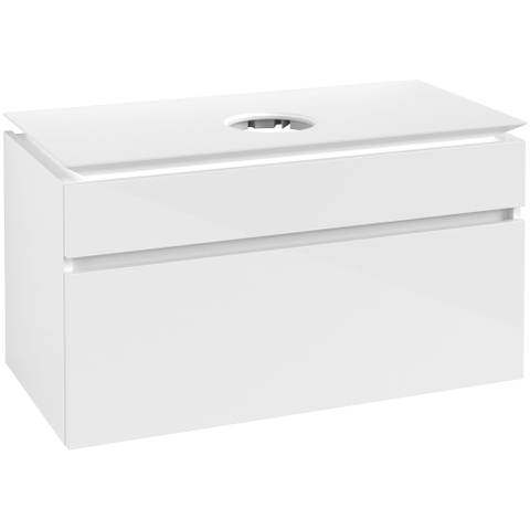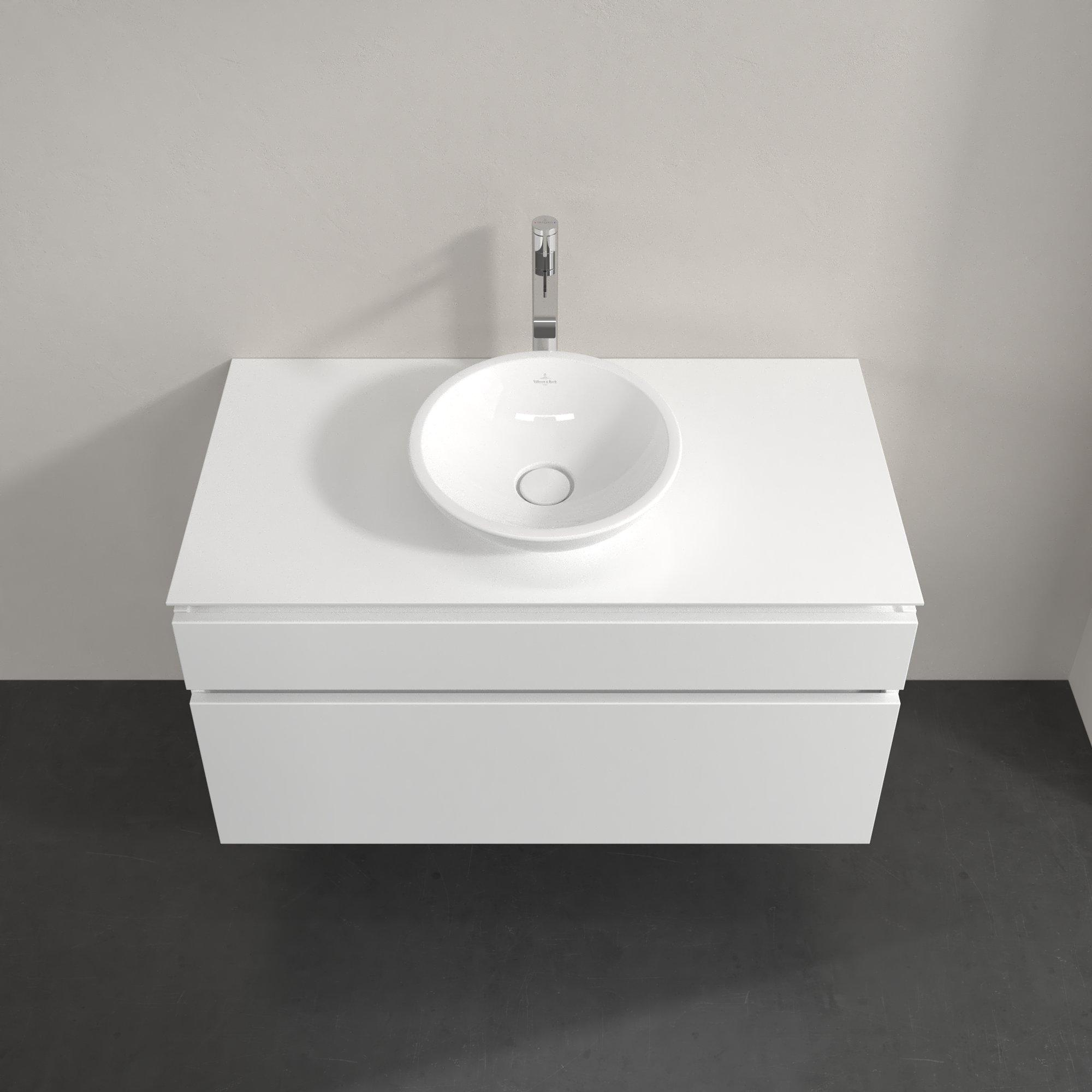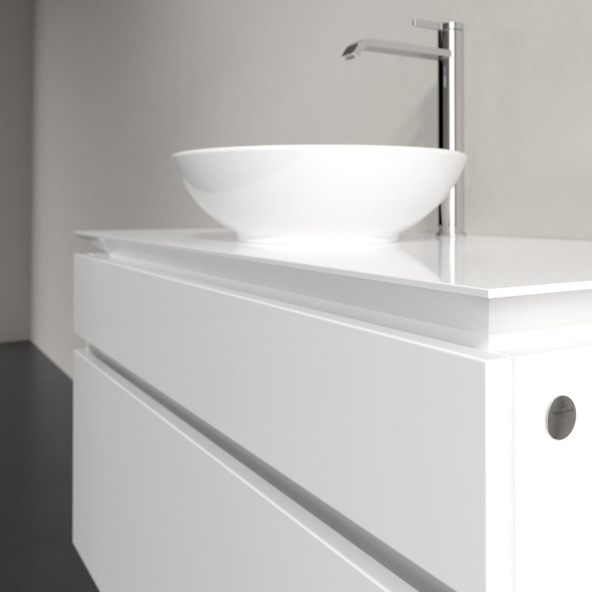 De wastafelonderkast van de collectie Legato van Villeroy & Boch straalt eenvoudige elegantie uit en overtuigt ook functioneel. De afgeschuinde rand van het wastafelblad geeft het meubel een bijna zwevende look. Het greeploze, onderhoudsvriendelijke en slijtvaste front van acrylfolie onderstreept het minimalistische design dat bij elke stijl past. In de beide ruime lades met variabele binnenindeling kunnen verzorgings- en stylingproducten dankzij verstelbare glazen scheidingswandjes, een opbergbox en een antislipbodem eenvoudig worden opgeborgen. Ingebouwde dempers zorgen ervoor dat de lades weer zacht sluiten.