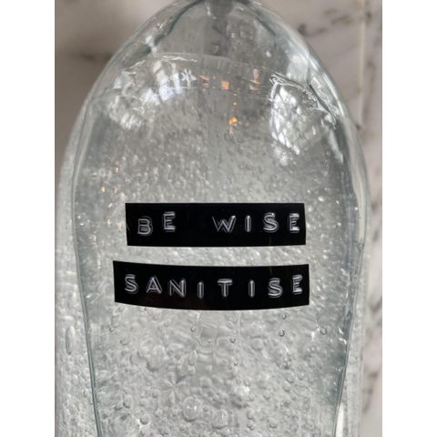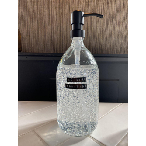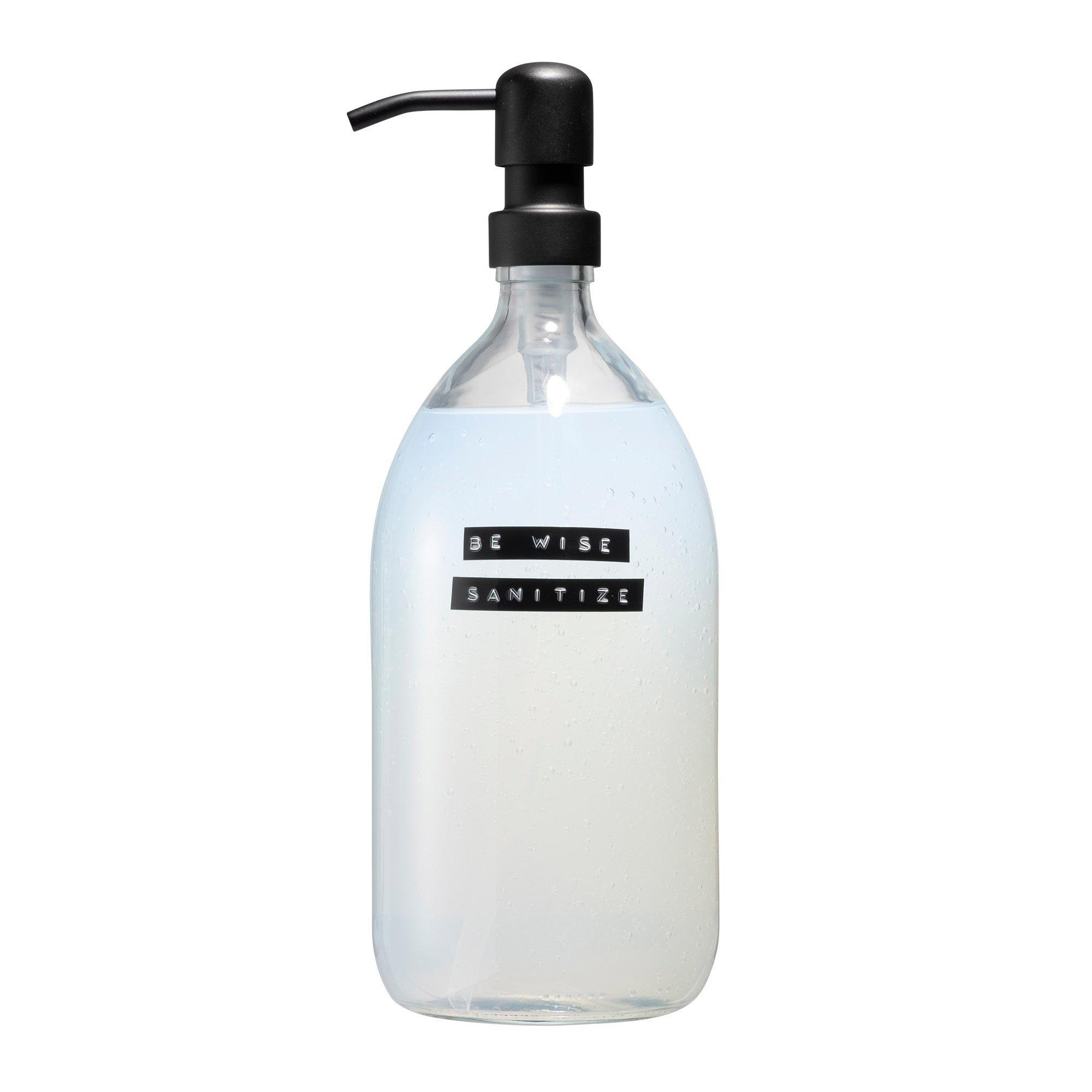 Wellmark Sanitiser helder glas zwarte pomp 1000ml tekst BE WISE SANITISE