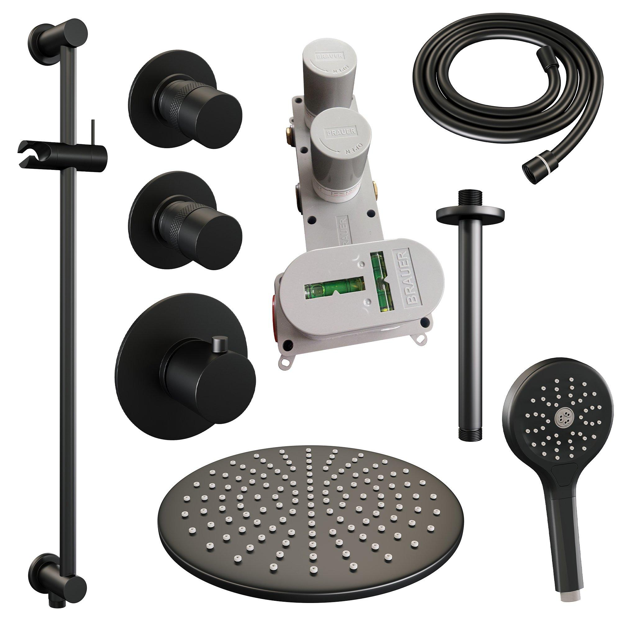 Brauer Black Edition Regendoucheset inbouw - hoofddouche 30cm - plafondarm 20cm - 3 gladde knoppen - handdouche rond 3 standen - mat zwart