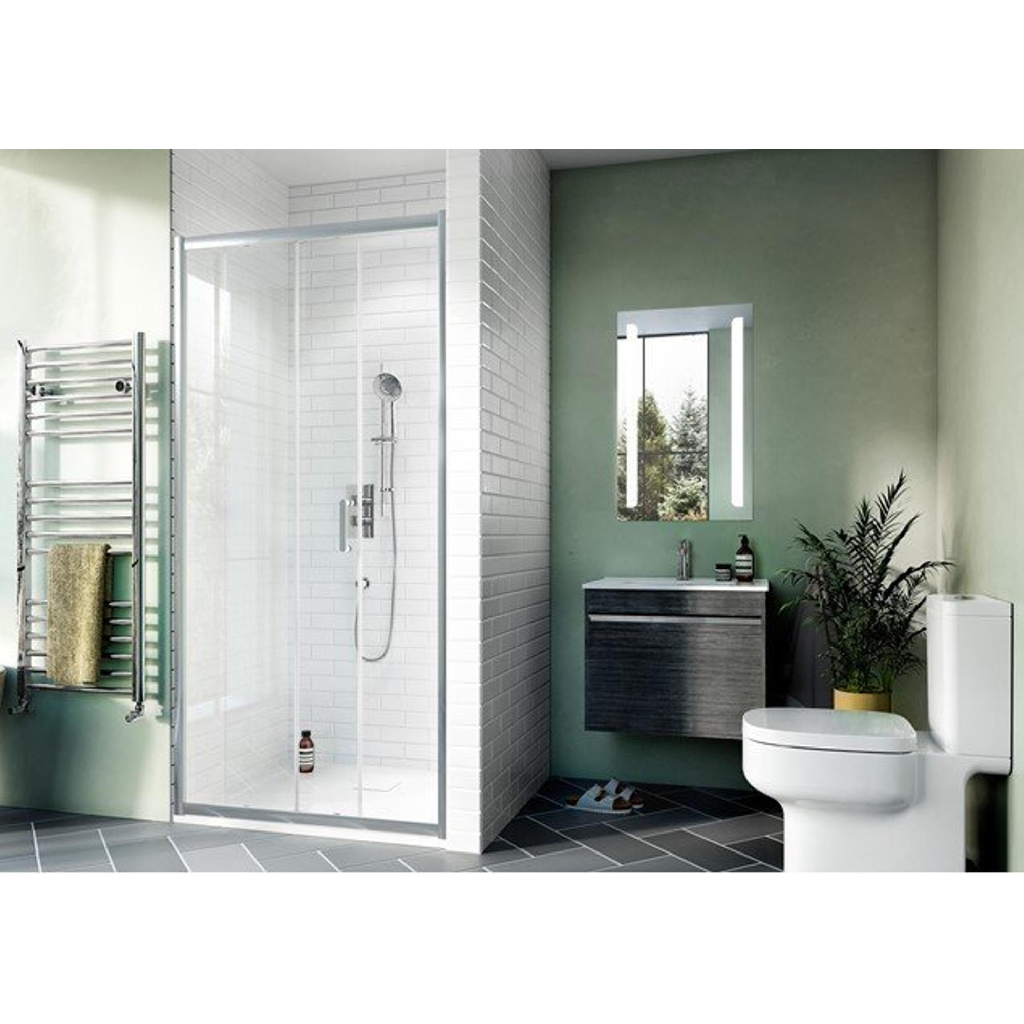 Dit ontwerp geniet van een zilveren profiel, wat zowel elegant als stoer oogt. Dankzij het zilveren profiel van de Crosswater schuifdeur kun je hem perfect gebruiken in een natuurlijke badkamer. Verder vinden wij dat je deze douchedeur ook schitterend kunt gebruiken in een industriële stijl of als je veel gebruik wilt maken van betonlook of andere natuurstenen.
