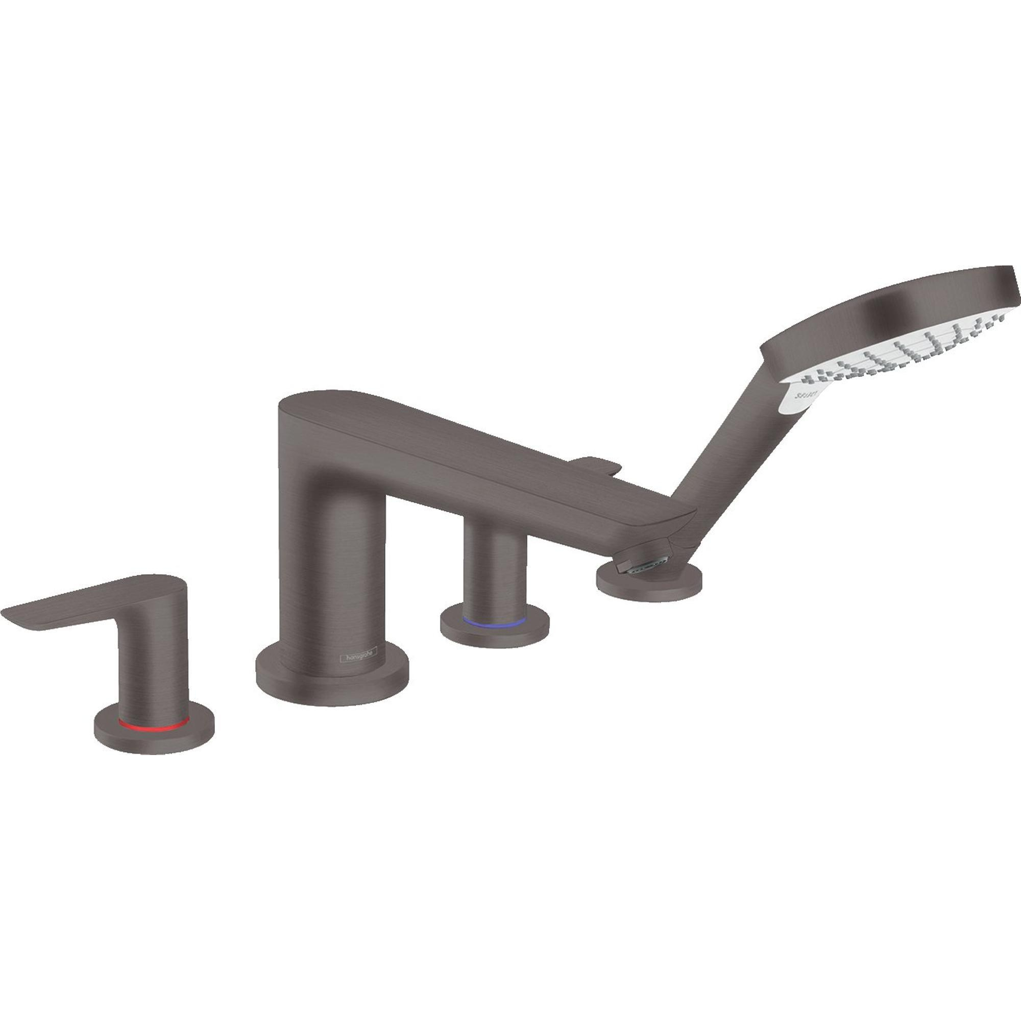 De 4-gats badrandmengkraan Talis E in Brushed Black Chrome van hansgrohe kenmerkt zich door zowel kleur als functie. Zoals bij alle Talis E modellen wordt het design van de badmengkraan gekenmerkt door weelderige, zwevende oppervlakken, precieze kanten en zacht toelopende vormen. Door de geborstelde finish in glanzend zwart chroom is de 4-gats mengkraan een designstatement aan de badrand, dat heel goed in een modern badkamerinterieur past. Met beide rechts en links van de baduitloop geplaatste vlakke grepen kunt u heet en koud water apart instellen. Voor de installatie is het inbouwdeel #13244180 nodig. De handdouche met uittrekbare doucheslang biedt veel bewegingsvrijheid - voor eenvoudig haren wassen of uitspoelen van het bad. Voor heel veel waterplezier en snel vullen zorgen de doorstroomhoeveelheden aan de aansluiting van de douchekop/baduitloop: 17/20 l/min (bij 3 bar).