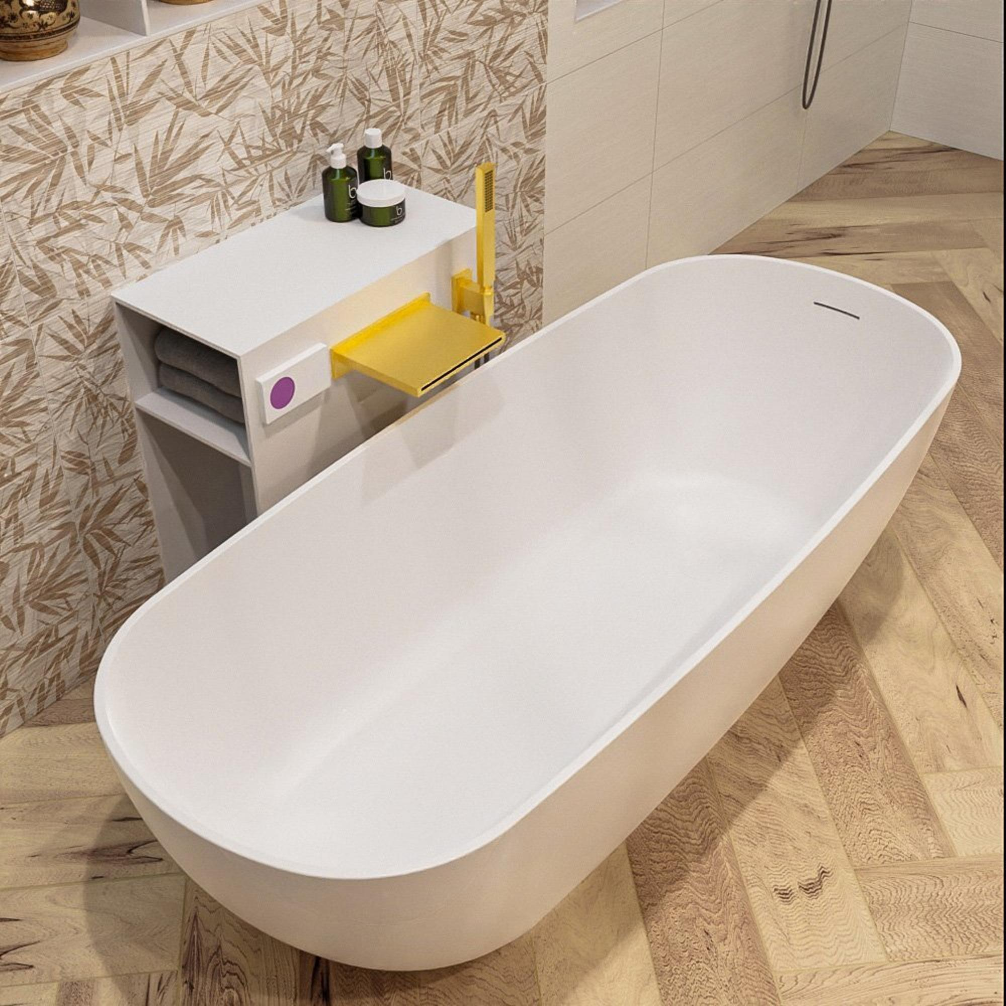 Dit vrijstaande bad straalt stijl en elegantie uit dankzij zijn slanke en moderne ontwerp. De gladde afwerking en strakke lijnen zorgen voor een tijdloze uitstraling die moeiteloos past bij diverse badkamerstijlen. Of je nu een moderne of klassieke inrichting hebt, dit bad voegt een vleugje luxe toe aan elke ruimte.