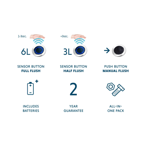 De werking van de spoelknop is eenvoudig. Als je 1 tot 3 seconden over de sensor zweeft, zal de 6 liter spoeling automatisch plaatsvinden. Indien je je hand langer dan 3 seconden boven de sensor houdt, zal de 3 liter spoeling starten. Extra handig; je kunt ook de knop ‘normaal’ indrukken om een handmatige spoeling te starten. De knop heeft een diameter van 59 mm. De montageset en de batterijen zijn inbegrepen.