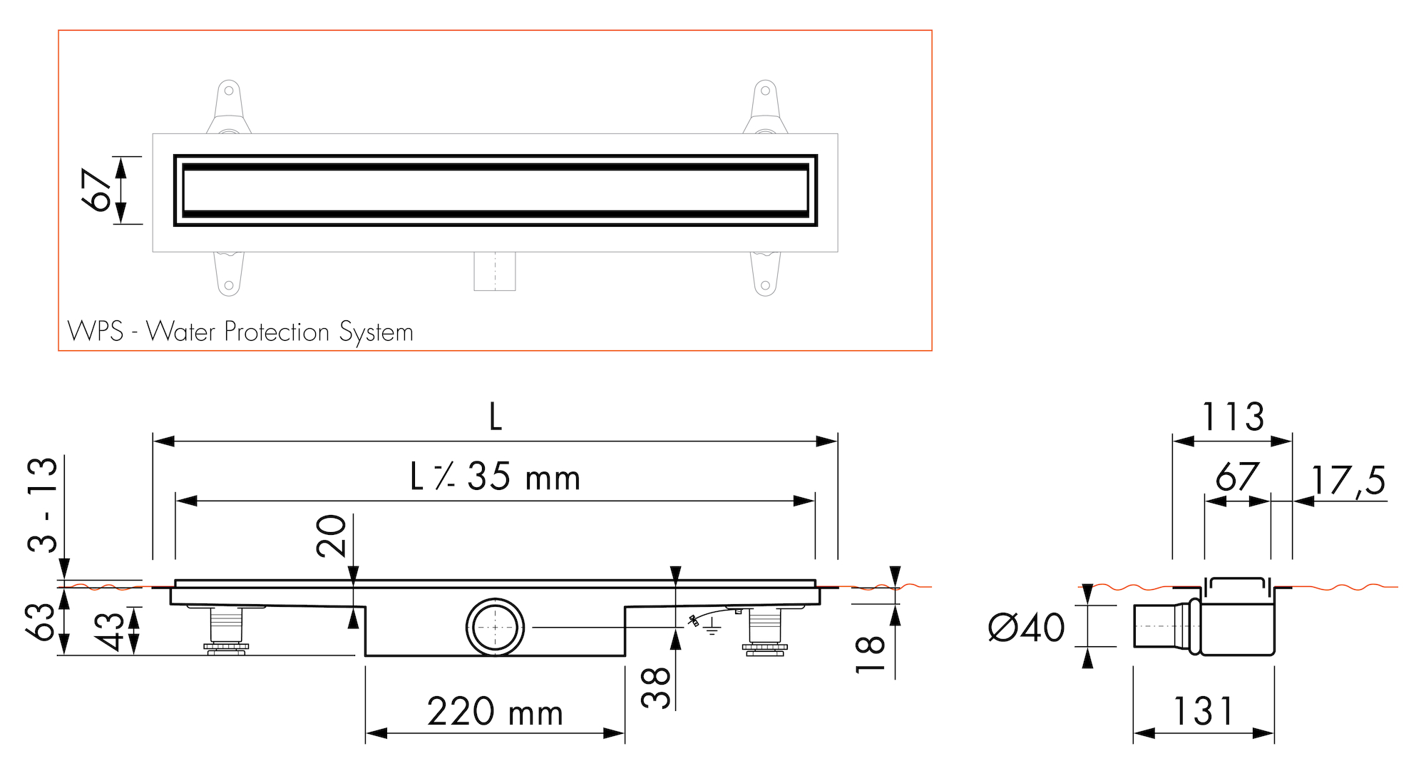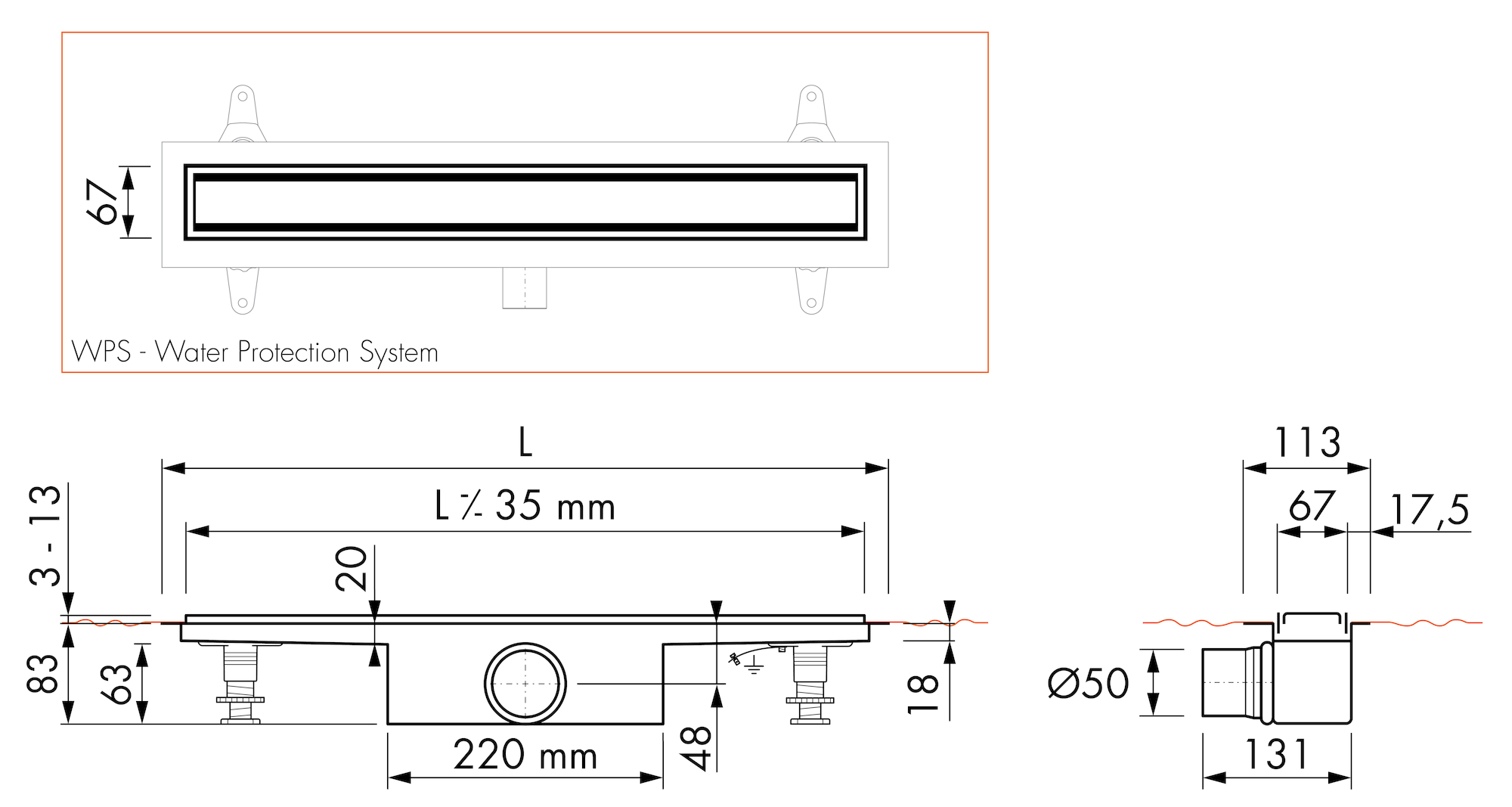 - Waterslot: 50mm