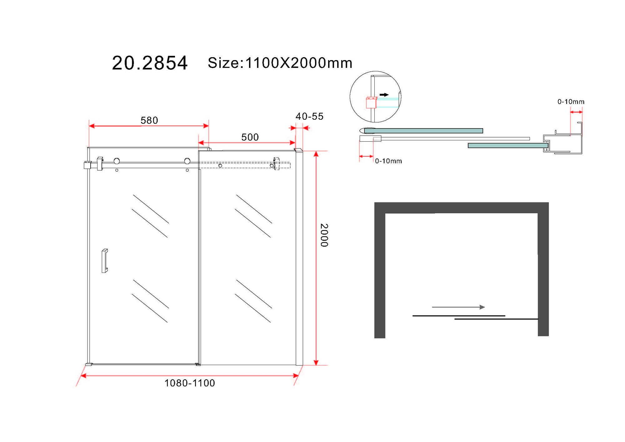 1100mm breed 2000mm hoog.